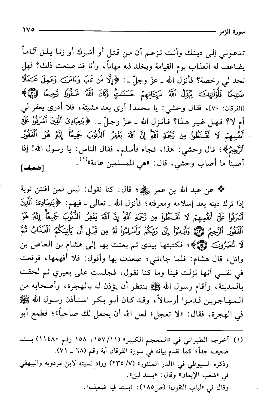 تدعوني إلى دينك وأنت تزعم أن من قتل أو أشرك أو زنا يلق آثاماً يضاعف له العذاب يوم القيامة ويخلد فيه مهاناً، وأنا قد صنعت ذلك؟ فهل تجد لي رخصة؟ فأنزل الله -عزّ وجلّ-: {إِلَّا مَنْ تَابَ وَآمَنَ وَعَمِلَ عَمَلًا صَالِحًا فَأُولَئِكَ يُبَدِّلُ اللَّهُ سَيِّئَاتِهِمْ حَسَنَاتٍ وَكَانَ اللَّهُ غَفُورًا رَحِيمًا (70)} [الفرقان: 70]، فقال وحشي: يا محمد! أرى بعد مشيئة، فلا أدري يغفر لي أم لا؟ فهل غير هذا؟ فأنزل الله -عزّ وجلّ-: {يَاعِبَادِيَ الَّذِينَ أَسْرَفُوا عَلَى أَنْفُسِهِمْ لَا تَقْنَطُوا مِنْ رَحْمَةِ اللَّهِ إِنَّ اللَّهَ يَغْفِرُ الذُّنُوبَ جَمِيعًا إِنَّهُ هُوَ الْغَفُورُ الرَّحِيمُ}؛ قال وحشي: هذا، فجاء فأسلم، فقال الناس: يا رسول الله! إذا أصبنا ما أصاب وحشي، قال: "هي للمسلمين عامة" (¬1). [ضعيف]