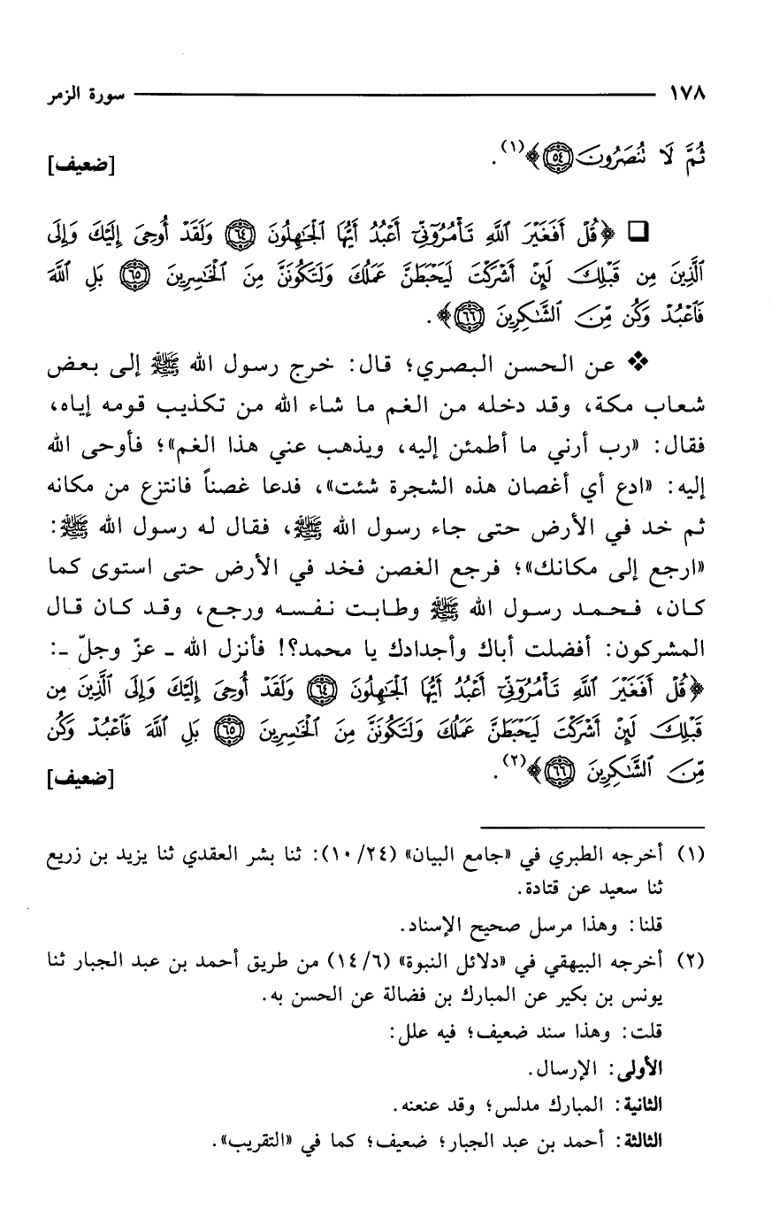 * عن الحسن البصري؛ قال: خرج رسول الله - صلى الله عليه وسلم - إلى بعض شعاب مكة، وقد دخله من الغم ما شاء الله من تكذيب قومه إياه، فقال: "رب أرني ما أطمئن إليه، ويذهب عني هذا الغم"؛ فأوحى الله إليه: "ادع أي أغصان هذه الشجرة شئت"، فدعا غصناً فانتزع من مكانه ثم خد في الأرض حتى جاء رسول الله - صلى الله عليه وسلم -، فقال له رسول الله - صلى الله عليه وسلم -: "ارجع إلى مكانك"؛ فرجع الغصن فخد في الأرض حتى استوى كما كان، فحمد رسول الله - صلى الله عليه وسلم - طابت نفسه ورجع، وقد كان قال المشركون: أفضلت أباك وأجدادك يا محمد؟! فأنزل الله -عزّ وجلّ-: {قُلْ أَفَغَيْرَ اللَّهِ تَأْمُرُونِّي أَعْبُدُ أَيُّهَا الْجَاهِلُونَ (64) وَلَقَدْ أُوحِيَ إِلَيْكَ وَإِلَى الَّذِينَ مِنْ قَبْلِكَ لَئِنْ أَشْرَكْتَ لَيَحْبَطَنَّ عَمَلُكَ وَلَتَكُونَنَّ مِنَ الْخَاسِرِينَ (65) بَلِ اللَّهَ فَاعْبُدْ وَكُنْ مِنَ الشَّاكِرِينَ (66)} (¬2). [ضعيف]