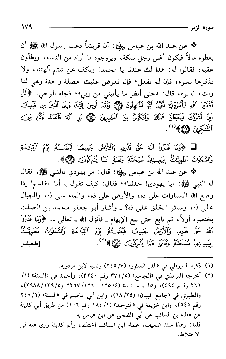 * عن عبد الله بن عباس -رضي الله عنهما-؛ قال: مر يهودي بالنبي - صلى الله عليه وسلم -، فقال له النبي - صلى الله عليه وسلم -: "يا يهودي! حدثنا"؛ فقال: كيف تقول يا أبا القاسم! إذا وضع الله السماوات على ذه، والأرض على ذه، والماء على ذه، والجبال على ذه، وسائر الخلق على ذه؟ -وأشار أبو جعفر محمد بن الصلت بخنصره أولاً، ثم تابع حتى بلغ الإبهام- فأنزل الله -تعالى-: {وَمَا قَدَرُوا اللَّهَ حَقَّ قَدْرِهِ وَالْأَرْضُ جَمِيعًا قَبْضَتُهُ يَوْمَ الْقِيَامَةِ وَالسَّمَاوَاتُ مَطْوِيَّاتٌ بِيَمِينِهِ سُبْحَانَهُ وَتَعَالَى عَمَّا يُشْرِكُونَ (67)} (¬2). [ضعيف]