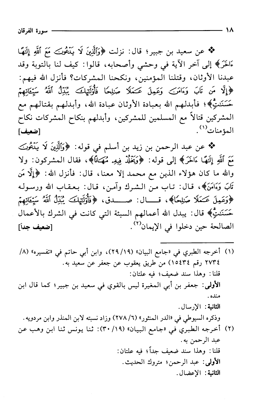 * عن عبد الرحمن بن زيد بن أسلم في قوله: {وَالَّذِينَ لَا يَدْعُونَ مَعَ اللَّهِ إِلَهًا آخَرَ} إلى قوله: {وَيَخْلُدْ فِيهِ مُهَانًا}، فقال المشركون: ولا والله ما كان هؤلاء الذين مع محمد إلا معنا، قال: فأنزل الله: {إِلَّا مَنْ تَابَ وَآمَنَ}، قال: تاب من الشرك وآمن، قال: بعقاب الله ورسوله {وَعَمِلَ عَمَلًا صَالِحًا}، قال: صدق، {فَأُولَئِكَ يُبَدِّلُ اللَّهُ سَيِّئَاتِهِمْ حَسَنَاتٍ} قال: يبدل الله أعمالهم السيئة التي كانت في الشرك بالأعمال الصالحة حين دخلوا في الإيمان (¬2). [ضعيف جداً]