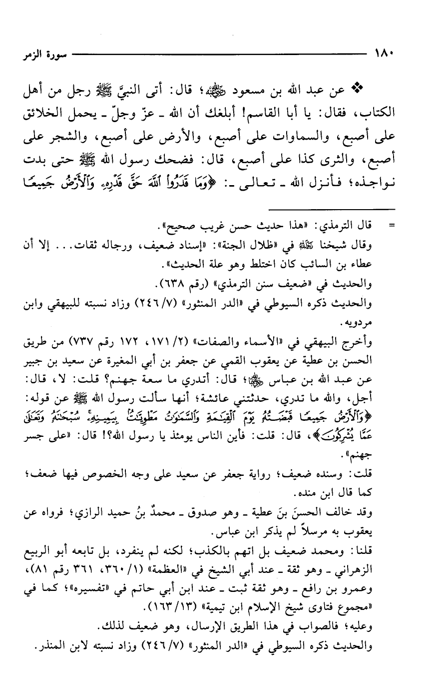 * عن عبد الله بن مسعود -رضي الله عنه-؛ قال: أتى النبيَّ - صلى الله عليه وسلم - رجل من أهل الكتاب، فقال: يا أبا القاسم! أبلغك أن الله -عزّ وجلّ- يحمل الخلائق على أصبع، والسماوات على أصبع، والأرض على أصبع، والشجر على أصبع، والثرى كذا على أصبع، قال: فضحك رسول الله - صلى الله عليه وسلم - حتى بدت نواجذه؛ فأنزل الله -تعالى-: {وَمَا قَدَرُوا اللَّهَ حَقَّ قَدْرِهِ وَالْأَرْضُ جَمِيعًا