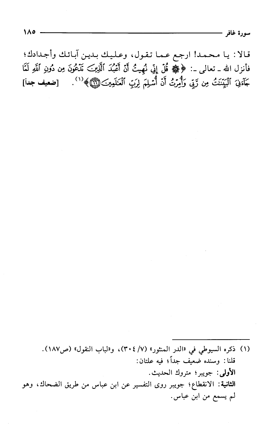 قا لا: يا محمد! ارجع عما تقول، وعليك بدين آبائك وأجدادك؛ فأنزل الله -تعالى-: {قُلْ إِنِّي نُهِيتُ أَنْ أَعْبُدَ الَّذِينَ تَدْعُونَ مِنْ دُونِ اللَّهِ لَمَّا جَاءَنِيَ الْبَيِّنَاتُ مِنْ رَبِّي وَأُمِرْتُ أَنْ أُسْلِمَ لِرَبِّ الْعَالَمِينَ (66)} (¬1). [ضعيف جداً]