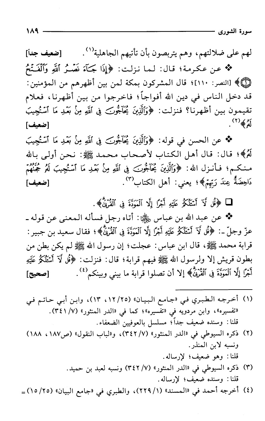 * عن عكرمة؛ قال: لما نزلت: {إِذَا جَاءَ نَصْرُ اللَّهِ وَالْفَتْحُ} [النصر: 1]؛ قال المشركون بمكة لمن بين أظهرهم من المؤمنين: قد دخل الناس في دين الله أفواجاً؛ فأخرجوا من بين أظهرنا، فعلام تقيمون بين أظهرنا؟ فنزلت: {وَالَّذِينَ يُحَاجُّونَ فِي اللَّهِ مِنْ بَعْدِ مَا اسْتُجِيبَ لَهُ} (¬2). [ضعيف]