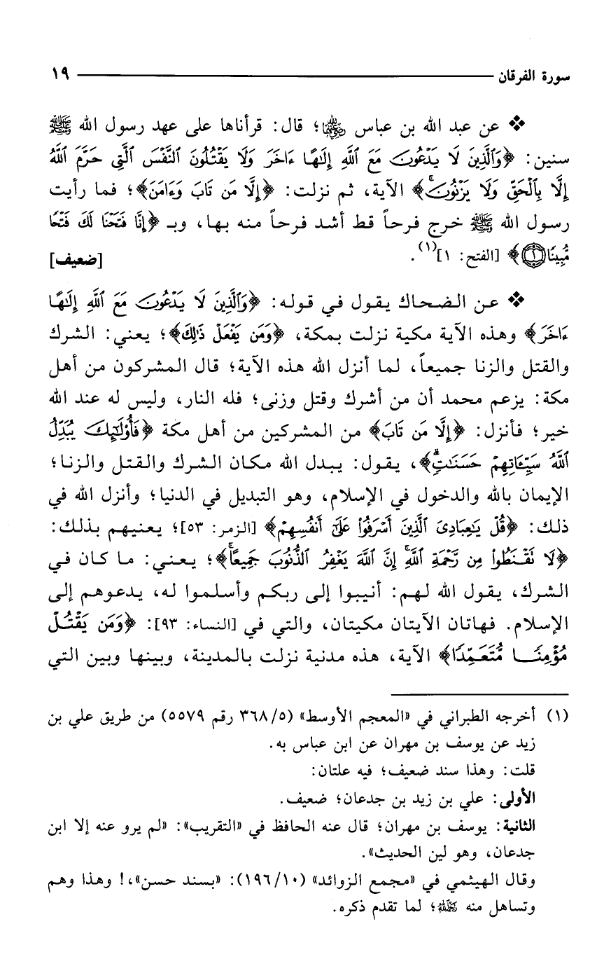 * عن عبد الله بن عباس -رضي الله عنهما-؛ قال: قرأناها على عهد رسول الله - صلى الله عليه وسلم - سنين: {وَالَّذِينَ لَا يَدْعُونَ مَعَ اللَّهِ إِلَهًا آخَرَ وَلَا يَقْتُلُونَ النَّفْسَ الَّتِي حَرَّمَ اللَّهُ إِلَّا بِالْحَقِّ وَلَا يَزْنُونَ} الآية، ثم نزلت: {إِلَّا مَنْ تَابَ وَآمَنَ}؛ فما رأيت رسول الله - صلى الله عليه وسلم - خرج فرحاً قط أشد فرحاً منه بها، وبـ {إِنَّا فَتَحْنَا لَكَ فَتْحًا مُبِينًا} [الفتح: 1] (¬1). [ضعيف]