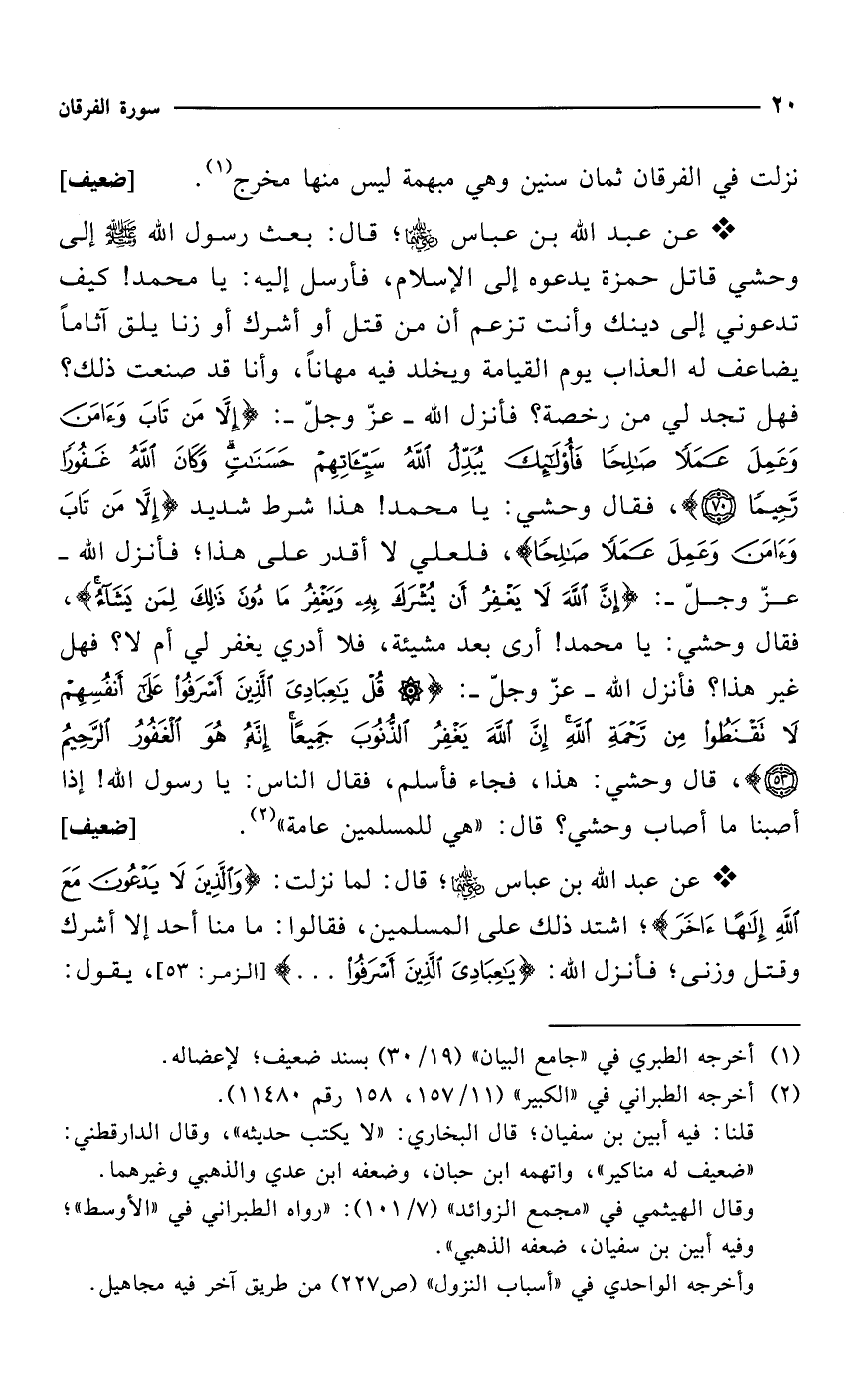 * عن عبد الله بن عباس -رضي الله عنهما-؛ قال: بعث رسول الله - صلى الله عليه وسلم - إلى وحشي قاتل حمزة يدعوه إلى الإسلام، فأرسل إليه: يا محمد! كيف تدعوني إلى دينك وأنت تزعم أن من قتل أو أشرك أو زنا يلق آثاماً يضاعف له العذاب يوم القيامة ويخلد فيه مهاناً، وأنا قد صنعت ذلك؟ فهل تجد لي من رخصة؟ فأنزل الله -عزّ وجلّ-: {إِلَّا مَنْ تَابَ وَآمَنَ وَعَمِلَ عَمَلًا صَالِحًا فَأُولَئِكَ يُبَدِّلُ اللَّهُ سَيِّئَاتِهِمْ حَسَنَاتٍ وَكَانَ اللَّهُ غَفُورًا رَحِيمًا (70)}، فقال وحشي: يا محمد! هذا شرط شديد {إِلَّا مَنْ تَابَ وَآمَنَ وَعَمِلَ عَمَلًا صَالِحًا}، فلعلي لا أقدر على هذا؛ فأنزل الله -عزّ وجلّ-: {إِنَّ اللَّهَ لَا يَغْفِرُ أَنْ يُشْرَكَ بِهِ وَيَغْفِرُ مَا دُونَ ذَلِكَ لِمَنْ يَشَاءُ}، فقال وحشي: يا محمد! أرى بعد مشيئة، فلا أدري يغفر لي أم لا؟ فهل غير هذا؟ فأنزل الله -عزّ وجلّ-: {قُلْ يَاعِبَادِيَ الَّذِينَ أَسْرَفُوا عَلَى أَنْفُسِهِمْ لَا تَقْنَطُوا مِنْ رَحْمَةِ اللَّهِ إِنَّ اللَّهَ يَغْفِرُ الذُّنُوبَ جَمِيعًا إِنَّهُ هُوَ الْغَفُورُ الرَّحِيمُ (53)}، قال وحشي: هذا، فجاء فأسلم، فقال الناس: يا رسول الله! إذا أصبنا ما أصاب وحشي؟ قال: "هي للمسلمين عامة" (¬2). [ضعيف]
