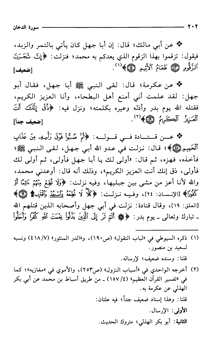* عن عكرمة؛ قال: لقى النبي - صلى الله عليه وسلم - أبا جهل، فقال أبو جهل: لقد علمت أني أمنع أهل البطحاء، وأنا العزيز الكريم، فقتله الله يوم بدر وأذله وعيره بكلمته؛ ونزل فيه: {ذُقْ إِنَّكَ أَنْتَ الْعَزِيزُ الْكَرِيمُ (49)} (¬2). [ضعيف جداً]
