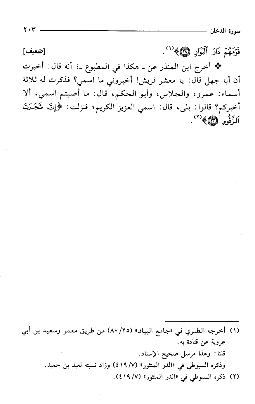 * أخرج ابن المنذر عن -هكذا في المطبوع-؛ أنه قال: أخبرت أن أبا جهل قال: يا معشر قريش! أخبروني ما اسمي؟ فذكرت له ثلاثة أسماء: عمرو، والجلاس، وأبو الحكم، قال: ما أصبتم اسمي، ألا أخبركم؟ قالوا: بلى، قال: اسمي العزيز الكريم؛ فنزلت: {إِنَّ شَجَرَتَ الزَّقُّومِ (43)} (¬2).