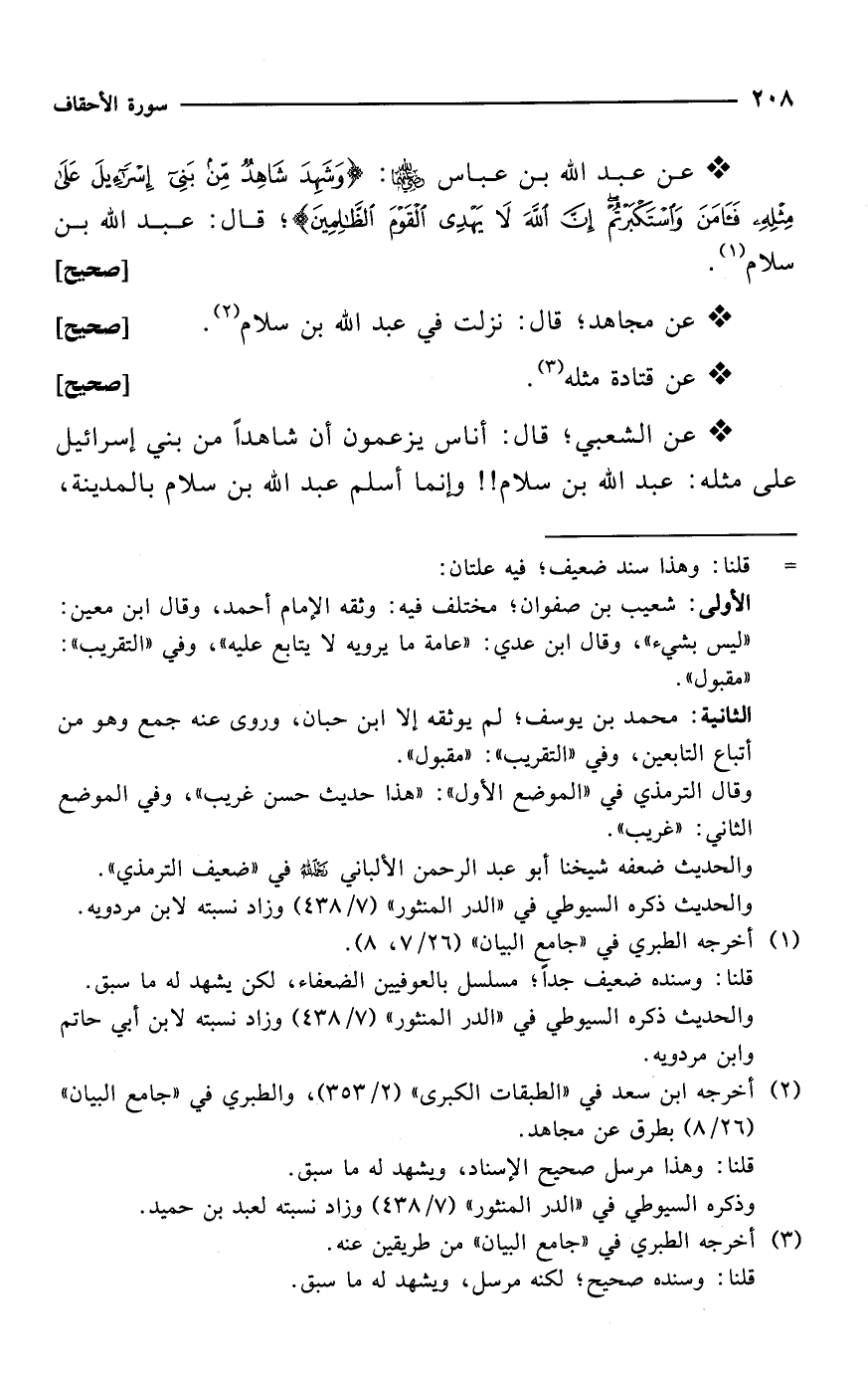 * عن عبد الله بن عباس -رضي الله عنهما-: {وَشَهِدَ شَاهِدٌ مِنْ بَنِي إِسْرَائِيلَ عَلَى مِثْلِهِ فَآمَنَ وَاسْتَكْبَرْتُمْ إِنَّ اللَّهَ لَا يَهْدِي الْقَوْمَ الظَّالِمِينَ}؛ قال: عبد الله بن سلام (¬1). [صحيح]