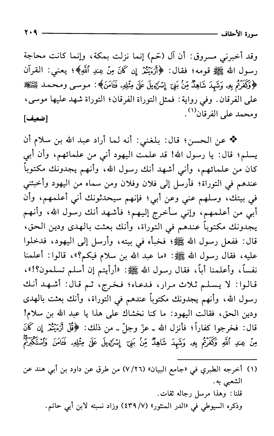 * عن الحسن؛ قال: بلغني: أنه لما أراد عبد الله بن سلام أن يسلم؛ قال: يا رسول الله! قد علمت اليهود أني من علمائهم، وأن أبي كان من علمائهم، وأني أشهد أنك رسول الله، وأنهم يجدونك مكتوباً عندهم في التوراة؛ فأرسل إلى فلان وفلان ومن سماه من اليهود وأخبئني في بيتك، وسلهم عني وعن أبي؛ فإنهم سيحدثونك أني أعلمهم، وأن أبي من أعلمهم، وإني سأخرج إليهم؛ فأشهد أنك رسول الله، وأنهم يجدونك مكتوباً عندهم في التوراة، وأنك بعثت بالهدى ودين الحق، قال: ففعل رسول الله - صلى الله عليه وسلم -؛ فخبأه في بيته، وأرسل إلى اليهود، فدخلوا عليه، فقال رسول الله - صلى الله عليه وسلم -: "ما عبد الله بن سلام فيكم؟ "، قالوا: أعلمنا نفساً، وأعلمنا أباً، فقال رسول الله - صلى الله عليه وسلم -: "أرأيتم إن أسلم تسلمون؟! "، قالوا: لا يسلم ثلاث مرار، فدعاه؛ فخرج، ثم قال: أشهد أنك رسول الله، وأنهم يجدونك مكتوباً عندهم في التوراة، وأنك بعثت بالهدى ودين الحق، فقالت اليهود: ما كنا نخشاك على هذا يا عبد الله بن سلام! قال: فخرجوا كفاراً؛ فأنزل الله -عزّ وجلّ- من ذلك: {قُلْ أَرَأَيْتُمْ إِنْ كَانَ مِنْ عِنْدِ اللَّهِ وَكَفَرْتُمْ بِهِ وَشَهِدَ شَاهِدٌ مِنْ بَنِي إِسْرَائِيلَ عَلَى مِثْلِهِ فَآمَنَ وَاسْتَكْبَرْتُمْ