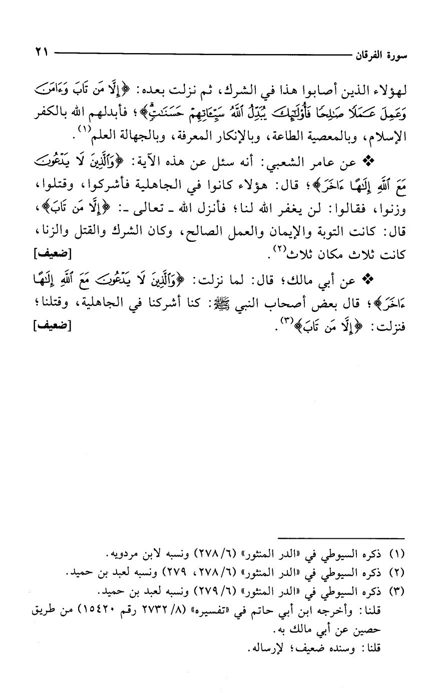 * عن أبي مالك؛ قال: لما نزلت: {وَالَّذِينَ لَا يَدْعُونَ مَعَ اللَّهِ إِلَهًا آخَرَ}؛ قال بعض أصحاب النبي - صلى الله عليه وسلم -: كنا أشركنا في الجاهلية، وقتلنا؛ فنزلت: {إِلَّا مَنْ تَابَ} (¬3). [ضعيف]