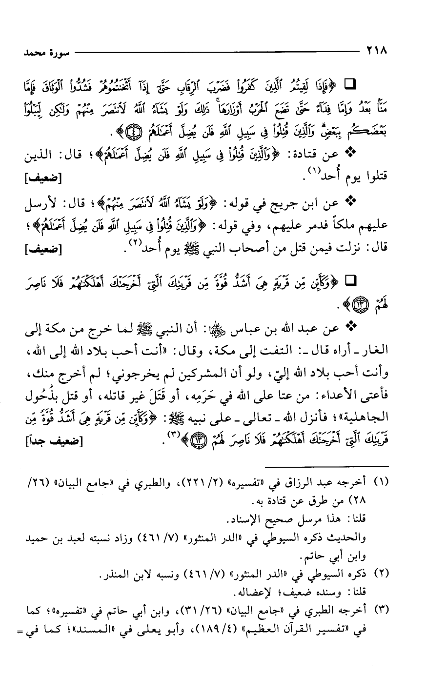 * عن قتادة: {وَالَّذِينَ قُتِلُوا فِي سَبِيلِ اللَّهِ فَلَنْ يُضِلَّ أَعْمَالَهُمْ}؛ قال: الذين قتلوا يوم أُحد (¬1). [ضعيف]