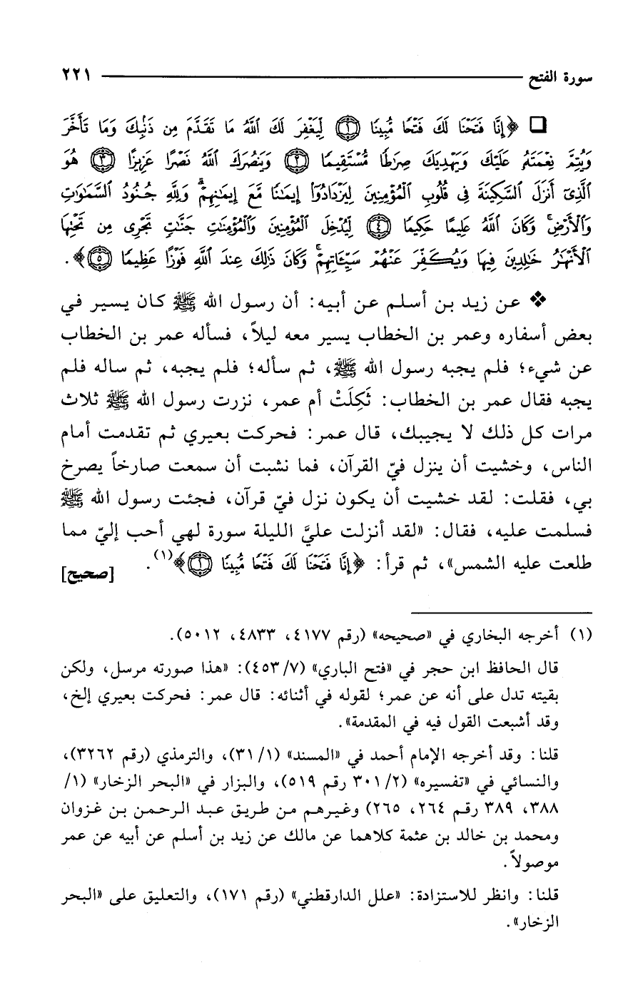 * عن زيد بن أسلم عن أبيه: أن رسول الله - صلى الله عليه وسلم - كان يسير في بعض أسفاره وعمر بن الخطاب يسير معه ليلاً، فسأله عمر بن الخطاب عن شيء؛ فلم يجبه رسول الله - صلى الله عليه وسلم -، ثم مسألة؛ فلم يجبه، ثم سألة فلم يجبه فقال عمر بن الخطاب: ثَكِلَتْ أم عمر، نزرت رسول الله - صلى الله عليه وسلم - ثلاث مرات كل ذلك لا يجيبك، قال عمر: فحركت بعيري ثم تقدمت أمام الناس، وخشيت أن ينزل فيّ القرآن، فما نشبت أن سمعت صارخاً يصرخ بي، فقلت: لقد خشيت أن يكون نزل فيّ قرآن، فجئت رسول الله - صلى الله عليه وسلم - فسلمت عليه، فقال: "لقد أنزلت عليَّ الليلة سورة لهي أحب إليّ مما طلعت عليه الشمس"، ثم قرأ: {إِنَّا فَتَحْنَا لَكَ فَتْحًا مُبِينًا (1)} (¬1). [صحيح]