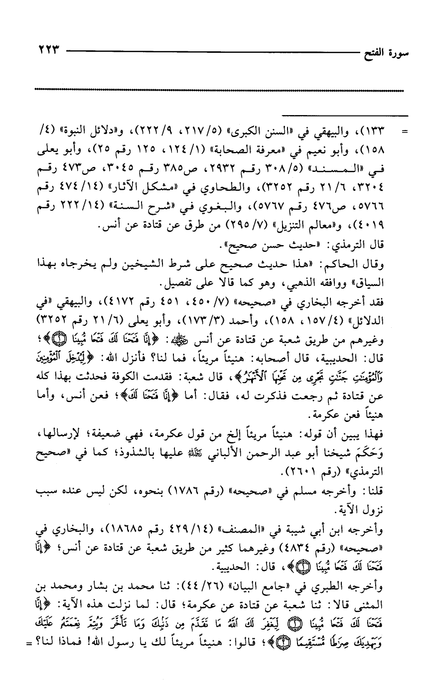 وأخرجه ابن أبي شيبة في "المصنف" (14/ 429 رقم 18685)، والبخاري في "صحيحه" (رقم 4834) وغيرهما كثير من طريق شعبة عن قتادة عن أنس؛ {إِنَّا فَتَحْنَا لَكَ فَتْحًا مُبِينًا (1)}، قال: الحديبية.