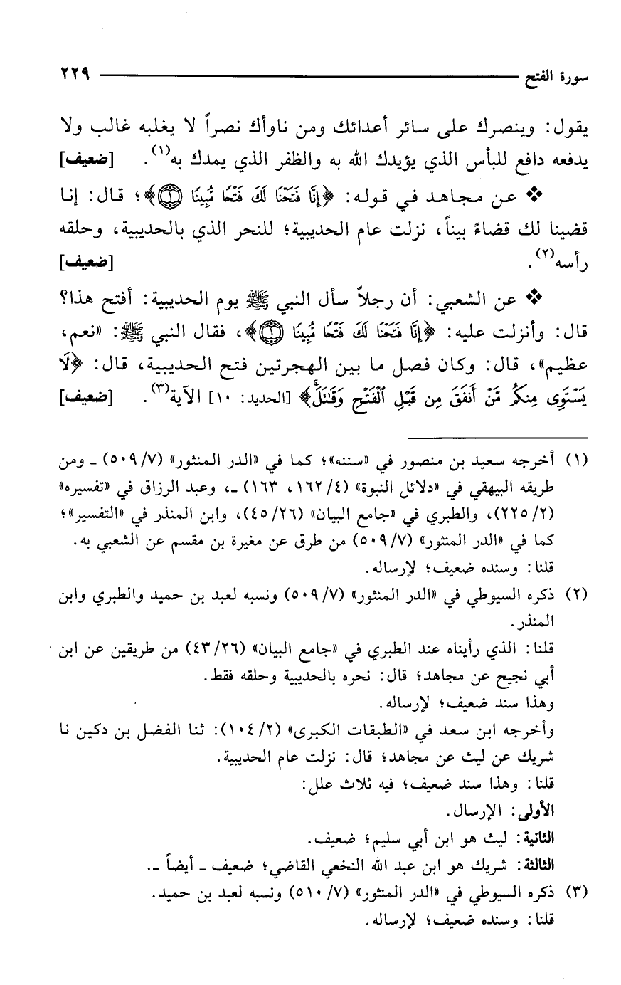 * عن الشعبي: أن رجلاً سأل النبي - صلى الله عليه وسلم - يوم الحديبية: أفتح هذا؟ قال: وأنزلت عليه: {إِنَّا فَتَحْنَا لَكَ فَتْحًا مُبِينًا}، فقال النبي - صلى الله عليه وسلم -: "نعم، عظيم"، قال: وكان فصل ما بين الهجرتين فتح الحديبية، قال: {لَا يَسْتَوِي مِنْكُمْ مَنْ أَنْفَقَ مِنْ قَبْلِ الْفَتْحِ وَقَاتَلَ} [الحديد:10] الآية (¬3). [ضعيف]