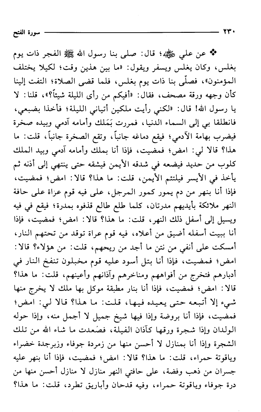 * عن علي -رضي الله عنه-؛ قال: صلى بنا رسول الله - صلى الله عليه وسلم - الفجر ذات يوم بغلس، وكان يغلس ويسفر ويقول: "ما بين هذين وقت؛ لكيلا يختلف المؤمنون"، فصلّى بنا ذات يوم بغلس، فلما قضى الصلاة؛ التفت إلينا كأن وجهه ورقة مصحف، فقال: "أفيكم من رأى الليلة شيئاً؟ "، قلنا: لا يا رسول الله! قال: "لكني رأيت ملكين أتياني الليلة؛ فأخذا بضبعي، فانطلقا بي إلى السماء الدنيا، فمررت بَمَلك وأمامه آدمي وبيده صخرة فيضرب بهامة الآدمي؛ فيقع دماغه جانباً، وتقع الصخرة جانباً، قلت: ما هذا؟ قالا لي: امض؛ فمضيت، فإذا أنا بملك وأمامه آدمي وبيد الملك كلوب من حديد فيضعه في شدقه الأيمن فيشقه حتى ينتهي إلى أذنه ثم يأخذ في الأيسر فيلتئم الأيمن، قلت: ما هذا؟ قالا: امض؛ فمضيت، فإذا أنا بنهر من دم يمور كمور المرجل، على فيه قوم عراة على حافة النهر ملائكة بأيديهم مدرتان، كما طلع طالع قذفوه بمدرة؛ فيقع في فيه ويسيل إلى أسفل ذلك النهر، قلت: ما هذا؟ قالا: امض؛ فمضيت، فإذا أنا ببيت أسفله أضيق من أعلاه، فيه قوم عراة توقد من تحتهم النار، أمسكت على أنفي من نتن ما أجد من ريحهم، قلت: من هؤلاء؟ قالا: امض؛ فمضيت، فإذا أنا بتل أسود عليه قوم مخبلون تنفخ النار في أدبارهم فتخرج من أفواههم ومناخرهم وآذانهم وأعينهم، قلت: ما هذا؟ قالا: امض؛ فمضيت، فإذا أنا بنار مطبقة موكل بها ملك لا يخرج منها شيء إلا أتبعه حتى يعيده فيها، قلت: ما هذا؟ قالا لي: امض؛ فمضيت، فإذا أنا بروضة وإذا فيها شيخ جميل لا أجمل منه، وإذا حوله الولدان وإذا شجرة ورقها كآذان الفيلة، فصعدت ما شاء الله من تلك الشجرة وإذا أنا بمنازل لا أحسن منها من زمردة جوفاء وزبرجدة خضراء وياقوتة حمراء، قلت: ما هذا؟ قالا: امض؛ فمضيت، فإذا أنا بنهر عليه جسران من ذهب وفضة، على حافتي النهر منازل لا منازل أحسن منها من درة جوفاء وياقوتة حمراء، وفيه قدحان وأباريق تطرد، قلت: ما هذا؟