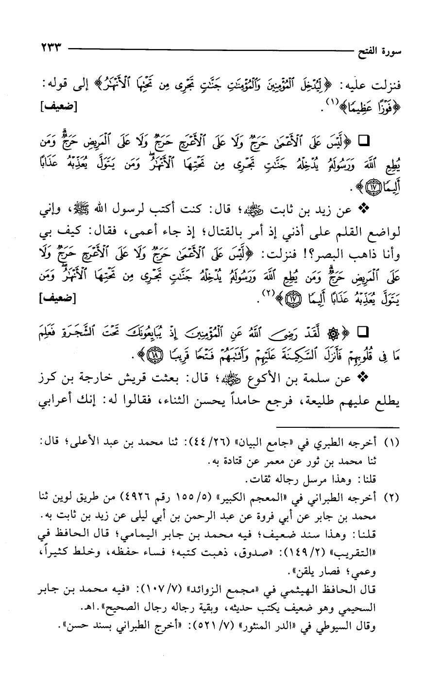 * عن زيد بن ثابت -رضي الله عنه-؛ قال: كنت أكتب لرسول الله - صلى الله عليه وسلم -، وإني لواضع القلم على أذني إذ أمر بالقتال؛ إذ جاء أعمى، فقال: كيف بي وأنا ذاهب البصر؟! فنزلت: {لَيْسَ عَلَى الْأَعْمَى حَرَجٌ وَلَا عَلَى الْأَعْرَجِ حَرَجٌ وَلَا عَلَى الْمَرِيضِ حَرَجٌ وَمَنْ يُطِعِ اللهَ وَرَسُولَهُ يُدْخِلْهُ جَنَّاتٍ تَجْرِي مِنْ تَحْتِهَا الْأَنْهَارُ وَمَنْ يَتَوَلَّ يُعَذِّبْهُ عَذَابًا أَلِيمًا (17)} (¬2). [ضعيف]