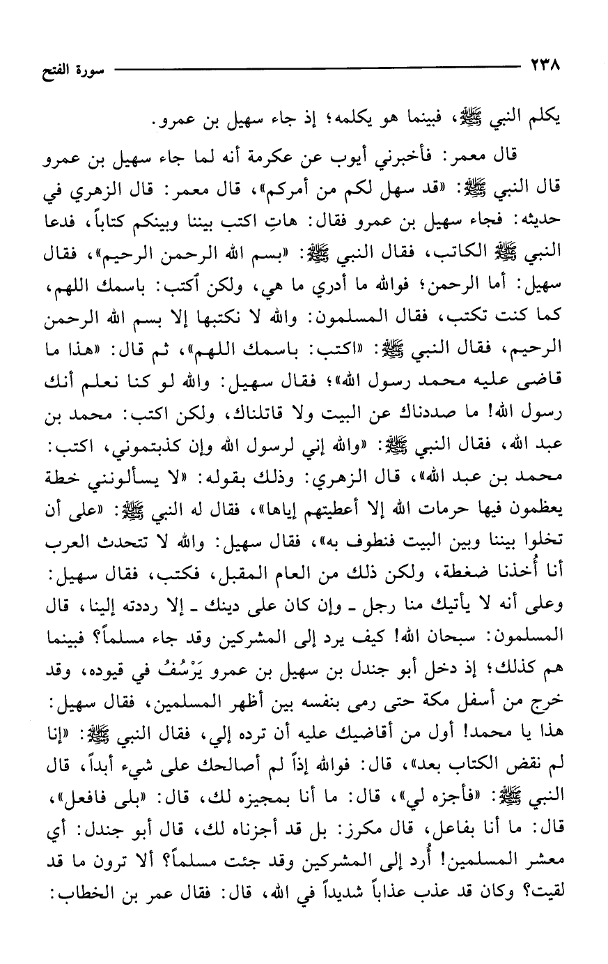 قال معمر: فأخبرني أيوب عن عكرمة أنه لما جاء سهيل بن عمرو قال النبي - صلى الله عليه وسلم -: "قد سهل لكم من أمركم"، قال معمر: قال الزهري في حديثه: فجاء سهيل بن عمرو فقال: هاتِ اكتب بيننا وبينكم كتاباً، فدعا النبي - صلى الله عليه وسلم - الكاتب، فقال النبي - صلى الله عليه وسلم -: "بِسْمِ اللَّهِ الرَّحْمَنِ الرَّحِيمِ"، فقال سهيل: أما الرحمن؛ فوالله ما أدري ما هي، ولكن اكتب: باسمك اللهم، كما كنت تكتب، فقال المسلمون: والله لا نكتبها إلا بِسْمِ اللَّهِ الرَّحْمَنِ الرَّحِيمِ، فقال النبي - صلى الله عليه وسلم -: "اكتب: باسمك اللهم"، ثم قال: "هذا ما قاضى عليه محمد رسول الله"؛ فقال سهيل: والله لو كنا نعلم أنك رسول الله! ما صددناك عن البيت ولا قاتلناك، ولكن اكتب: محمد بن عبد الله، فقال النبي - صلى الله عليه وسلم -: "والله إني لرسول الله وإن كذبتموني، اكتب: محمد بن عبد الله"، قال الزهري: وذلك بقوله: "لا يسألونني خطبة يعظمون فيها حرمات الله إلا أعطيتهم إياها"، فقال له النبي - صلى الله عليه وسلم -: "على أن تخلوا بيننا وبين البيت فنطوف به"، فقال سهيل: والله لا تتحدث العرب أنا أُخذنا ضغطة، ولكن ذلك من العام المقبل، فكتب، فقال سهيل: وعلى أنه لا يأتيك منا رجل -وإن كان على دينك- إلا رددته إلينا، قال المسلمون: سبحان الله! كيف يرد إلى المشركين وقد جاء مسلماً؟ فبينما هم كذلك؛ إذ دخل أبو جندل بن سهيل بن عمرو يَرْسُفُ في قيوده، وقد خرج من أسفل مكة حتى رمى بنفسه بين أظهر المسلمين، فقال سهيل: هذا يا محمد! أول من أقاضيك عليه أن ترده إلي، فقال النبي - صلى الله عليه وسلم -: "إنا لم نقض الكتاب بعد"، قال: فوالله إذاً لم أصالحك على شيء أبداً، قال النبي - صلى الله عليه وسلم -: "فأجزه لي"، قال: ما أنا بمجيزه لك، قال: "بلى فافعل"، قال: ما أنا بفاعل، قال مكرز: بل قد أجزناه لك، قال أبو جندل: أي معشر المسلمين! أُرد إلى المشركين وقد جئت مسلماً؟ ألا ترون ما قد لقيت؟ وكان قد عذب عذاباً شديداً في الله، قال: فقال عمر بن الخطاب: