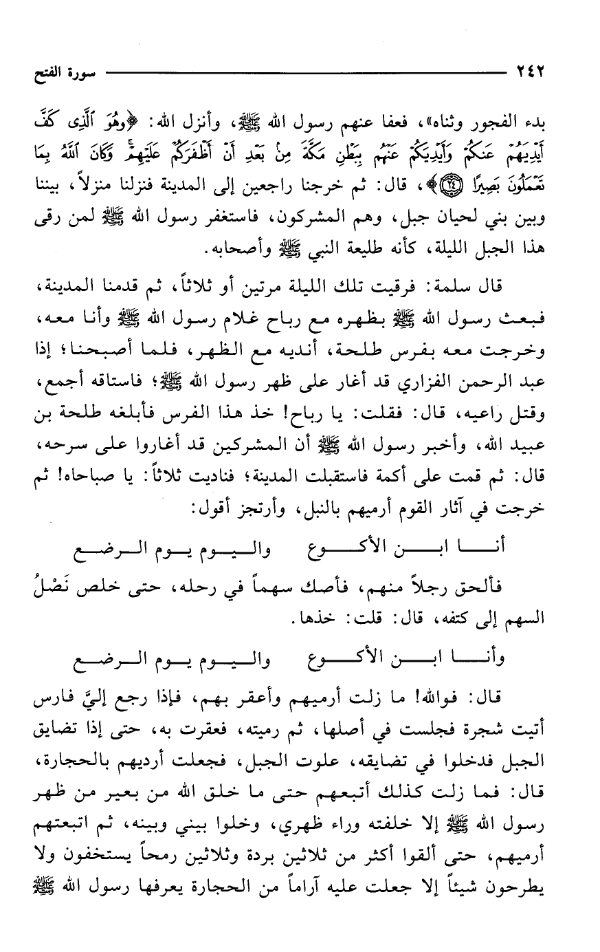 بدء الفجور وثناه"، فعفا عنهم رسول الله - صلى الله عليه وسلم -، وأنزل الله: {وَهُوَ الَّذِي كَفَّ أَيْدِيَهُمْ عَنْكُمْ وَأَيْدِيَكُمْ عَنْهُمْ بِبَطْنِ مَكَّةَ مِنْ بَعْدِ أَنْ أَظْفَرَكُمْ عَلَيْهِمْ وَكَانَ الله بِمَا تَعْمَلُونَ بَصِيرًا (24)}، قال: ثم خرجنا راجعين إلى المدينة فنزلنا منزلاً، بيننا وبين بني لحيان جبل، وهم المشركون، فاستغفر رسول الله - صلى الله عليه وسلم - لمن رقى هذا الجبل الليلة، كأنه طليعة النبي - صلى الله عليه وسلم - وأصحابه.