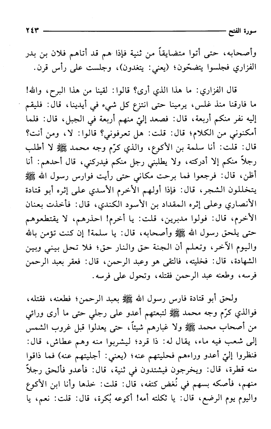 قال الفزاري: ما هذا الذي أرى؟ قالوا: لقينا من هذا البرح، والله! ما فارقنا منذ غلس، يرمينا حتى انتزع كل شيء في أيدينا، قال: فليقم إليه نفر منكم أربعة، قال: فصعد إليّ منهم أربعة في الجبل، قال: فلما أمكنوني من الكلام؛ قال: قلت: هل تعرفوني؟ قالوا: لا، ومن أنت؟ قال: قلت: أنا سلمة بن الأكوع، والذي كرّم وجه محمد - صلى الله عليه وسلم - لا أطلب رجلاً منكم إلا أدركته، ولا يطلبني رجل منكم فيدركني، قال أحدهم: أنا أظن، قال: فرجعوا فما برحت مكاني حتى رأيت فوارس رسول الله - صلى الله عليه وسلم - يتخللون الشجر، قال: فإذا أولهم الأخرم الأسدي على إثره أبو قتادة الأنصاري وعلى إثره المقداد بن الأسود الكندي، قال: فأخذت بعنان الأخرم، قال: فولوا مدبرين، قلت: يا أخرم! احذرهم، لا يقتطعوهم حتى يلحق رسول الله - صلى الله عليه وسلم - وأصحابه، قال: يا سلمة! إن كنت تؤمن بالله واليوم الآخر، وتعلم أن الجنة حق والنار حق؛ فلا تحل بيني وبين الشهادة، قال: فخليته، فالتقى هو وعبد الرحمن، قال: فعقر بعبد الرحمن فرسه، وطعنه عبد الرحمن فقتله، وتحول على فرسه.
