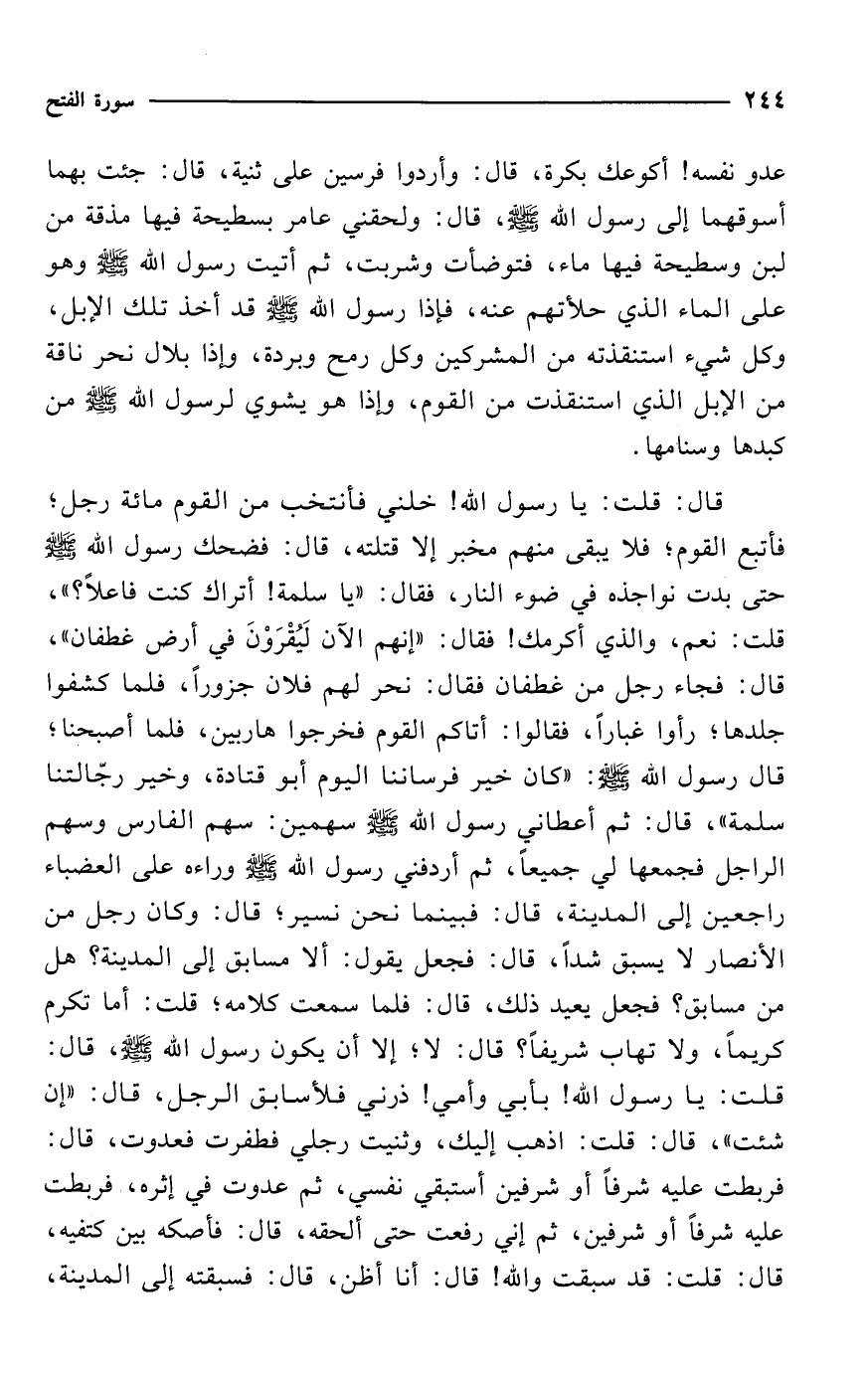 قال: قلت: يا رسول الله! خلني فأنتخب من القوم مائة رجل؛ فأتبع القوم؛ فلا يبقى منهم مخبر إلا قتلته، قال: فضحك رسول الله - صلى الله عليه وسلم - حتى بدت نواجذه في ضوء النار، فقال: "يا سلمة! أتراك كنت فاعلاً؟ "، قلت: نعم، والذي أكرمك! فقال: "إنهم الآن لَيُقْرَوْنَ في أرض غطفان"، قال: فجاء رجل من غطفان فقال: نحر لهم فلان جزوراً، فلما كشفوا جلدها؛ رأوا غباراً، فقالوا: أتاكم القوم فخرجوا هاربين، فلما أصبحنا؛ قال رسول الله - صلى الله عليه وسلم -: "كان خير فرساننا اليوم أبو قتادة، وخير رجّالتنا سلمة"، قال: ثم أعطاني رسول الله - صلى الله عليه وسلم - سهمين: سهم الفارس وسهم الراجل فجمعها لي جميعاً، ثم أردفني رسول الله - صلى الله عليه وسلم - وراءه على العضباء راجعين إلى المدينة، قال: فبينما نحن نسير؛ قال: وكان رجل من الأنصار لا يسبق شداً، قال: فجعل يقول: ألا مسابق إلى المدينة؟ هل من مسابق؟ فجعل يعيد ذلك، قال: فلما سمعت كلامه؛ قلت: أما تكرم كريماً، ولا تهاب شريفاً؟ قال: لا؛ إلا أن يكون رسول الله - صلى الله عليه وسلم -، قال: قلت: يا رسول الله! بأبي وأمي! ذرني فلأسابق الرجل، قال: "إن شئت"، قال: قلت: اذهب إليك، وثنيت رجلي فطفرت فعدوت، قال: فربطت عليه شرفاً أو شرفين أستبقي نفسي، ثم عدوت في إثره، فربطت عليه شرفاً أو شرفين، ثم إني رفعت حتى ألحقه، قال: فأصكه بين كتفيه، قال: قلت: قد سبقت والله! قال: أنا أظن، قال: فسبقته إلى المدينة،