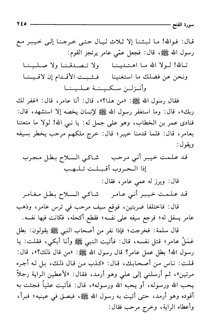 فقال رسول الله - صلى الله عليه وسلم -: "من هذا؟ "، قال: أنا عامر، قال: "غفر لك ربك"، قال: وما استغفر رسول الله - صلى الله عليه وسلم - لإنسان يخصه إلا استشهد، قال: فنادى عمر بن الخطاب، وهو على جمل له: يا نبي الله! لولا ما متعتنا بعامر، قال: فلما قدمنا خيبر؛ قال: خرج ملكهم مرحب يخطر بسيفه ويقول: