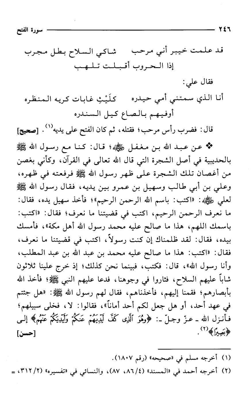* عن عبد الله بن مغفل -رضي الله عنه-؛ قال: كنا مع رسول الله - صلى الله عليه وسلم - بالحديبية في أصل الشجرة التي قال الله تعالى في القرآن، وكأني بغصن من أغصان تلك الشجرة على ظهر رسول الله - صلى الله عليه وسلم - فرفعته في ظهره، وعلي بن أبي طالب وسهيل بن عمرو بين يديه، فقال رسول الله - صلى الله عليه وسلم - لعلي -رضي الله عنه-: "اكتب: باسم الله الرحمن الرحيم"؛ فأخذ سهيل يده، فقال: ما نعرف الرحمن الرحيم، اكتب في قضيتنا ما نعرف؛ فقال: "اكتب: باسمك اللهم، هذا ما صالح عليه محمد رسول الله - صلى الله عليه وسلم - أهل مكة"، فأمسك بيده، فقال: لقد ظلمناك إن كنت رسولاً، اكتب في قضيتنا ما نعرف، فقال: "اكتب: هذا ما صالح عليه محمد بن عبد الله بن عبد المطلب، وأنا رسول الله"، قال: فكتب، فبينما نحن كذلك؛ إذ خرج علينا ثلاثون شاباً عليهم السلاح، فثاروا في وجوهنا، فدعا عليهم النبي - صلى الله عليه وسلم -؛ فأخذ الله بأبصارهم؛ فقمنا إليهم، فأخذناهم، فقال لهم رسول الله - صلى الله عليه وسلم -: "هل جئتم في عهد أحد، أو هل جعل لكم أحد أماناً"، فقالوا: لا، فخلى سبيلهم؛ فأنزل الله -عزّ وجلّ-: {وَهُوَ الَّذِي كَفَّ أَيْدِيَهُمْ عَنْكُمْ وَأَيْدِيَكُمْ عَنْهُمْ} إلى {بَصِيرًا} (¬2). [حسن]