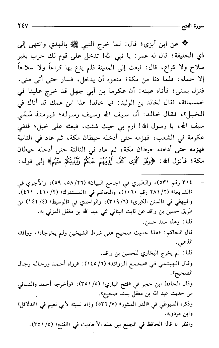 * عن ابن أبزى؛ قال: لما خرج النبي - صلى الله عليه وسلم - وبالهدي وانتهى إلى ذي الحليفة؛ قال له عمر: يا نبي الله! تدخل على قوم لك حرب بغير سلاح ولا كراع، قال: فبعث إلى المدينة فلم يدع بها كراعاً ولا سلاحاً إلا حمله، فلما دنا من مكة؛ منعوه أن يدخل، فسار حتى أتى منى، فنزل بمنى؛ فأتاه عينه: أن عكرمة بن أبي جهل قد خرج علينا في خمسمائة، فقال لخالد بن الوليد: "يا خالد! هذا ابن عمك قد أتاك في الخيل"، فقال خالد: أنا سيف الله وسيف رسوله؛ فيومئذ سُمّي سيف الله، يا رسول الله! ارم بي حيث شئت، فبعثه على خيل؛ فلقي عكرمة في الشعب، فهزمه حتى أدخله حيطان مكة، ثم عاد في الثانية فهزمه حتى أدخله حيطان مكة، ثم عاد في الثالثة حتى أدخله حيطان مكة؛ فأنزل الله: {وَهُوَ الَّذِي كَفَّ أَيْدِيَهُمْ عَنْكُمْ وَأَيْدِيَكُمْ عَنْهُمْ} إلى قوله:
