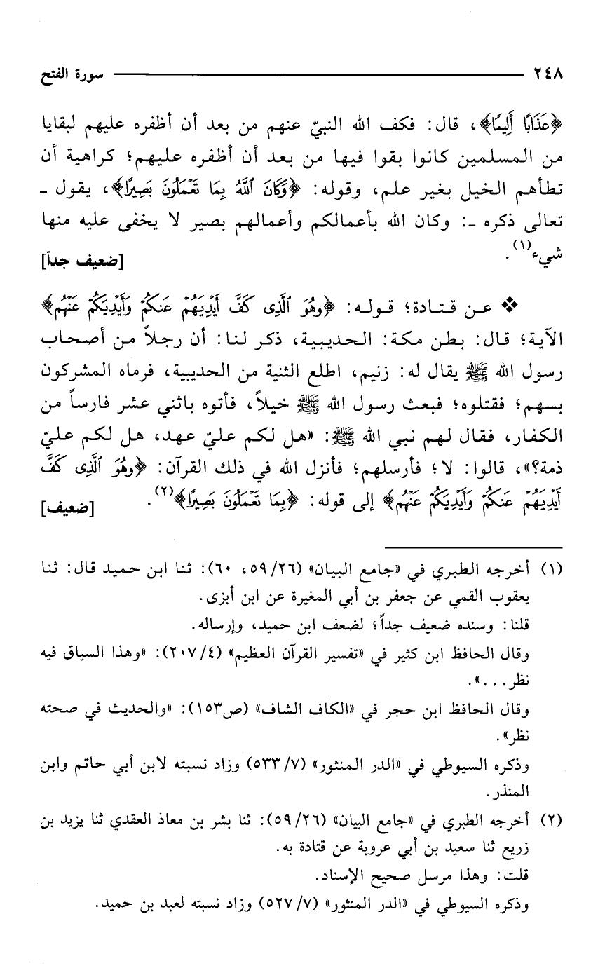 * عن قتادة؛ قوله: {وَهُوَ الَّذِي كَفَّ أَيْدِيَهُمْ عَنْكُمْ وَأَيْدِيَكُمْ عَنْهُمْ} الآية؛ قال: بطن مكة: الحديبية، ذكر لنا: أن رجلاً من أصحاب رسول الله - صلى الله عليه وسلم - يقال له: زنيم، اطلع الثنية من الحديبية، فرماه المشركون بسهم؛ فقتلوه؛ فبعث رسول الله - صلى الله عليه وسلم - خيلاً، فأتوه باثني عشر فارساً من الكفار، فقال لهم نبي الله - صلى الله عليه وسلم -: "هل لكم عليّ عهد، هل لكم عليّ ذمة؟ "، قالوا: لا؛ فأرسلهم؛ فأنزل الله في ذلك القرآن: {وَهُوَ الَّذِي كَفَّ أَيْدِيَهُمْ عَنْكُمْ وَأَيْدِيَكُمْ عَنْهُمْ} إلى قوله: {بِمَا تَعْمَلُونَ بَصِيرًا} (¬2). [ضعيف]