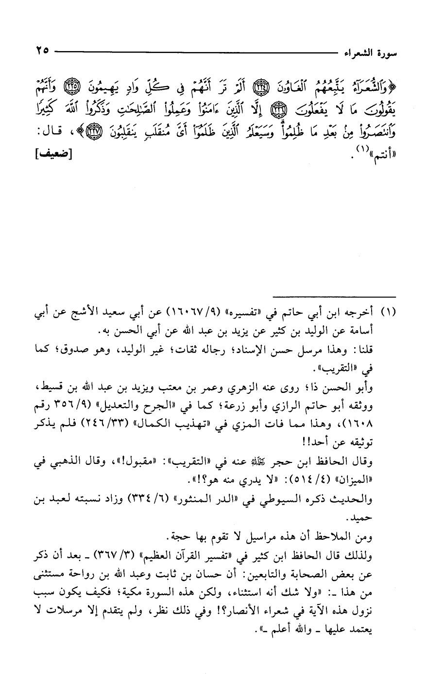 {وَالشُّعَرَاءُ يَتَّبِعُهُمُ الْغَاوُونَ (224) أَلَمْ تَرَ أَنَّهُمْ في كُلِّ وَادٍ يَهِيمُونَ (225) وَأَنَّهُمْ يَقُولُونَ مَا لَا يَفْعَلُونَ (226) إِلَّا الَّذِينَ آمَنُوا وَعَمِلُوا الصَّالِحَاتِ وَذَكَرُوا اللهَ كَثِيرًا وَانْتَصَرُوا مِنْ بَعْدِ مَا ظُلِمُوا وَسَيَعْلَمُ الَّذِينَ ظَلَمُوا أَيَّ مُنْقَلَبٍ يَنْقَلِبُونَ (227)}، قال: "أنتم" (¬1). [ضعيف]