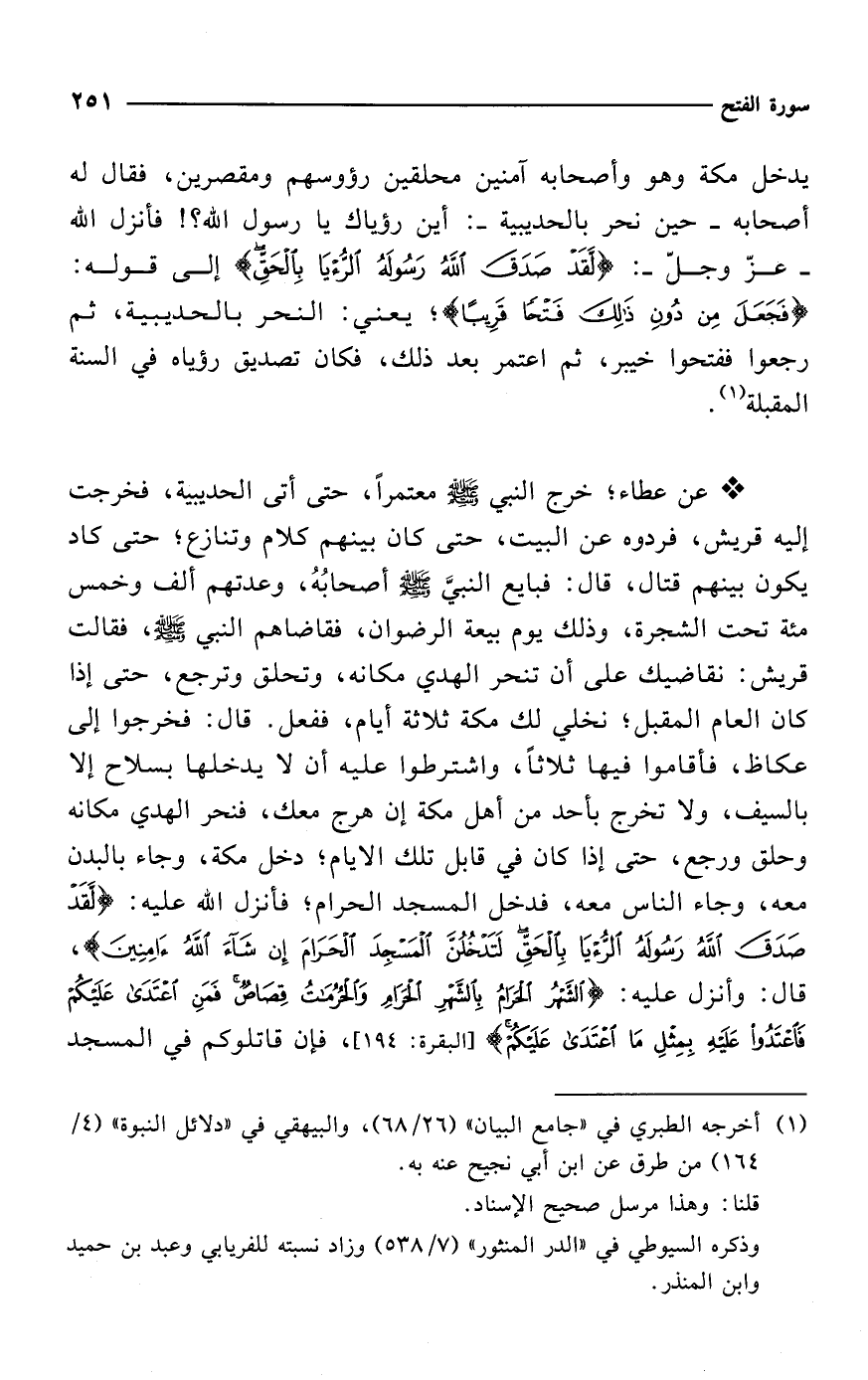 * عن عطاء؛ خرج النبي - صلى الله عليه وسلم - معتمراً، حتى أتى الحديبية، فخرجت إليه قريش، فردوه عن البيت، حتى كان بينهم كلام وتنازع؛ حتى كاد يكون بينهم قتال، قال: فبايع النبيَّ - صلى الله عليه وسلم - أصحابُهُ، وعدتهم ألف وخمس مئة تحت الشجرة، وذلك يوم بيعة الرضوان، فقاضاهم النبي - صلى الله عليه وسلم -، فقالت قريش: نقاضيك على أن تنحر الهدي مكانه، وتحلق وترجع، حتى إذا كان العام المقبل؛ نخلي لك مكة ثلاثة أيام، ففعل. قال: فخرجوا إلى عكاظ، فأقاموا فيها ثلاثًا، واشترطوا عليه أن لا يدخلها بسلاح إلا بالسيف، ولا تخرج بأحد من أهل مكة إن هرج معك، فنحر الهدي مكانه وحلق ورجع، حتى إذا كان في قابل تلك الأيام؛ دخل مكة، وجاء بالبدن معه، وجاء الناس معه، فدخل المسجد الحرام؛ فأنزل الله عليه: {لَقَدْ صَدَقَ الله رَسُولَهُ الرُّؤْيَا بِالْحَقِّ لَتَدْخُلُنَّ الْمَسْجِدَ الْحَرَامَ إِنْ شَاءَ الله آمِنِينَ}، قال: وأنزل عليه: {الشَّهْرُ الْحَرَامُ بِالشَّهْرِ الْحَرَامِ وَالْحُرُمَاتُ قِصَاصٌ فَمَنِ اعْتَدَى عَلَيْكُمْ فَاعْتَدُوا عَلَيْهِ بِمِثْلِ مَا اعْتَدَى عَلَيْكُمْ} [البقرة:194]، فإن قاتلوكم في المسجد