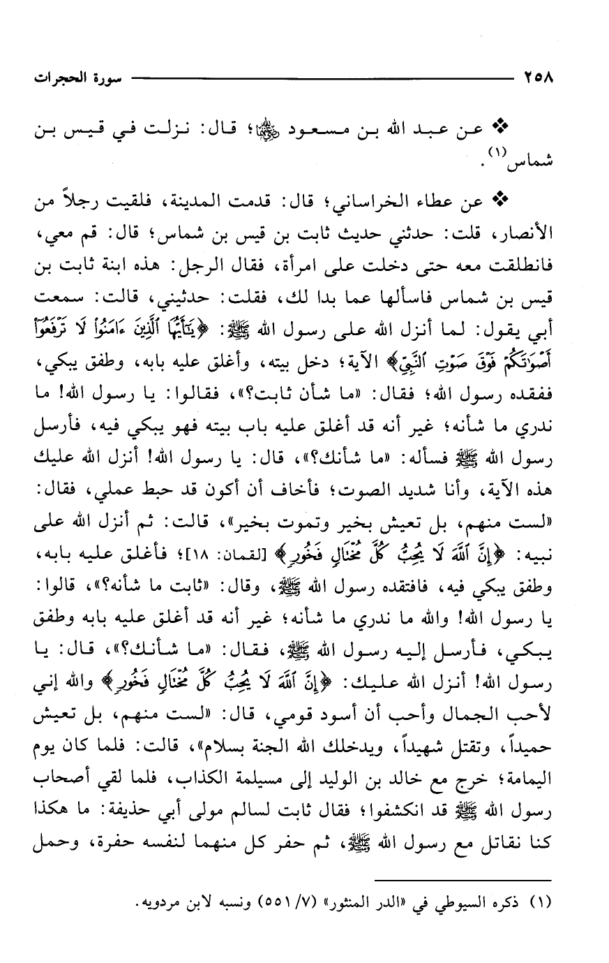 * عن عطاء الخراساني؛ قال: قدمت المدينة، فلقيت رجلاً من الأنصار، قلت: حدثني حديث ثابت بن قيس بن شماس؛ قال: قم معي، فانطلقت معه حتى دخلت على امرأة، فقال الرجل: هذه ابنة ثابت بن قيس بن شماس فاسألها عما بدا لك، فقلت: حدثيني، قالت: سمعت أبي يقول: لما أنزل الله على رسول الله - صلى الله عليه وسلم -: {يَاأَيُّهَا الَّذِينَ آمَنُوا لَا تَرْفَعُوا أَصْوَاتَكُمْ فَوْقَ صَوْتِ النَّبِيِّ} الآية؛ دخل بيته، وأغلق عليه بابه، وطفق يبكي، ففقده رسول الله - صلى الله عليه وسلم -؛ فقال: "ما شأن ثابت؟ "، فقالوا: يا رسول الله! ما ندري ما شأنه؛ غير أنه قد أغلق عليه باب بيته فهو يبكي فيه، فأرسل رسول الله - صلى الله عليه وسلم - فسأله: "ما شأنك؟ "، قال: يا رسول الله! أنزل الله عليك هذه الآية، وأنا شديد الصوت؛ فأخاف أن أكون قد حبط عملي، فقال: "لست منهم، بل تعيش بخير وتموت بخير"، قالت: ثم أنزل الله على نبيه: {إِنَّ اللهَ لَا يُحِبُّ كُلَّ مُخْتَالٍ فَخُورٍ} [لقمان:18]؛ فأغلق عليه بابه، وطفق يبكي فيه، فافتقده رسول الله - صلى الله عليه وسلم -، وقال: "ثابت ما شأنه؟ "، قالوا: يا رسول الله! والله ما ندري ما شأنه؛ غير أنه قد أغلق عليه بابه وطفق يبكي، فأرسل إليه رسول الله - صلى الله عليه وسلم -، فقال: "ما شأنك؟ "، قال: يا رسول الله! أنزل الله عليك: {إِنَّ اللهَ لَا يُحِبُّ كُلَّ مُخْتَالٍ فَخُورٍ} والله إني لأحب الجمال وأحب أن أسود قومي، قال: "لست منهم، بل تعيش حميداً، وتقتل شهيداً، ويدخلك الله الجنة بسلام"، قالت: فلما كان يوم اليمامة؛ خرج مع خالد بن الوليد إلى مسيلمة الكذاب، فلما لقي أصحاب رسول الله - صلى الله عليه وسلم - قد انكشفوا؛ فقال ثابت لسالم مولى أبي حذيفة: ما هكذا كنا نقاتل مع رسول الله - صلى الله عليه وسلم -، ثم حفر كل منهما لنفسه حفرة، وحمل