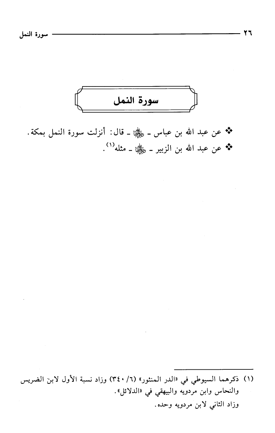 * عن عبد الله بن عباس -رضي الله عنهما- قال: أنزلت سورة النمل بمكة.