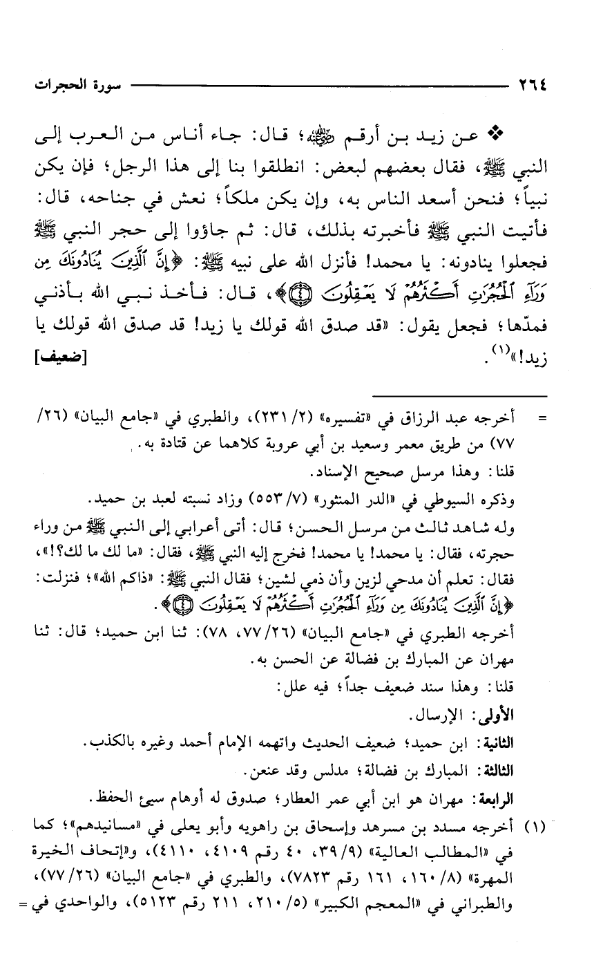 * عن زيد بن أرقم -رضي الله عنه-؛ قال: جاء أناس من العرب إلى النبي - صلى الله عليه وسلم -، فقال بعضهم لبعض: انطلقوا بنا إلى هذا الرجل؛ فإن يكن نبياً؛ فنحن أسعد الناس به، وإن يكن ملكاً؛ نعش في جناحه، قال: فأتيت النبي - صلى الله عليه وسلم - فأخبرته بذلك، قال: ثم جاؤوا إلى حجر النبي - صلى الله عليه وسلم - فجعلوا ينادونه: يا محمد! فأنزل الله على نبيه - صلى الله عليه وسلم -: {إِنَّ الَّذِينَ يُنَادُونَكَ مِنْ وَرَاءِ الْحُجُرَاتِ أَكْثَرُهُمْ لَا يَعْقِلُونَ (4)}، قال: فأخذ نبي الله بأذني فمدّها؛ فجعل يقول: "قد صدق الله قولك يا زيد! قد صدق الله قولك يا زيد! " (¬1). [ضعيف]