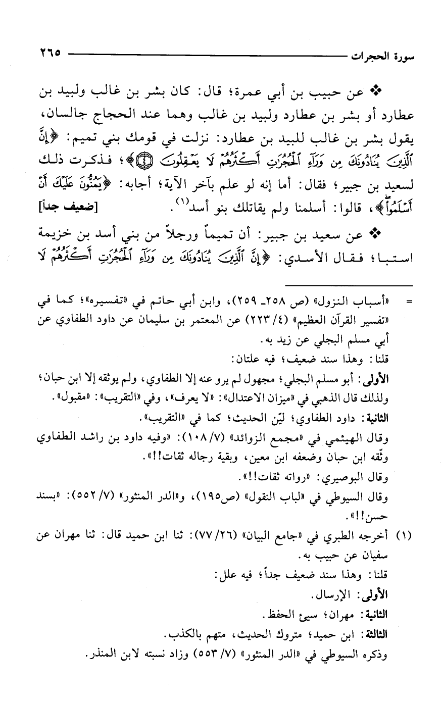 * عن حبيب بن أبي عمرة؛ قال: كان بشر بن غالب ولبيد بن عطارد أو بشر بن عطارد ولبيد بن غالب وهما عند الحجاج جالسان، يقول بشر بن غالب للبيد بن عطارد: نزلت في قومك بني تميم: {إِنَّ الَّذِينَ يُنَادُونَكَ مِنْ وَرَاءِ الْحُجُرَاتِ أَكْثَرُهُمْ لَا يَعْقِلُونَ (4)}؛ فذكرت ذلك لسعيد بن جبير؛ فقال: أما إنه لو علم بآخر الآية؛ أجابه: {يَمُنُّونَ عَلَيْكَ أَنْ أَسْلَمُوا}، قالوا: أسلمنا ولم يقاتلك بنو أسد (¬1). [ضعيف جداً]