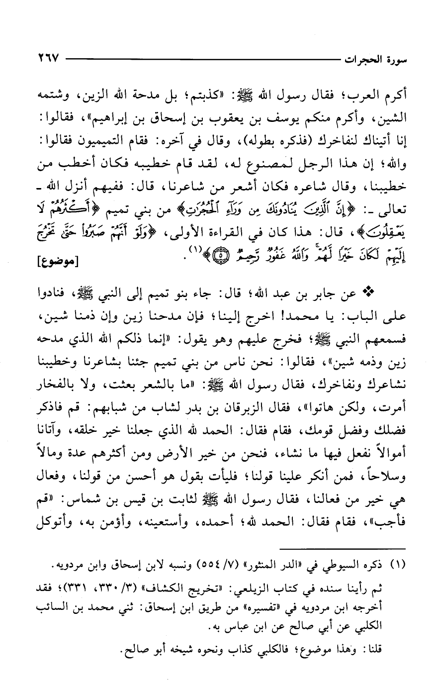 أكرم العرب؛ فقال رسول الله - صلى الله عليه وسلم -: "كذبتم؛ بل مدحة الله الزين، وشتمه الشين، وأكرم منكم يوسف بن يعقوب بن إسحاق بن إبراهيم"، فقالوا: إنا أتيناك لنفاخرك (فذكره بطوله)، وقال في آخره: فقام التميميون فقالوا: والله؛ إن هذا الرجل لمصنوع له، لقد قام خطيبه فكان أخطب من خطيبنا، وقال شاعره فكان أشعر من شاعرنا، قال: ففيهم أنزل الله -تعالى-: {إِنَّ الَّذِينَ يُنَادُونَكَ مِنْ وَرَاءِ الْحُجُرَاتِ} من بني تميم {أَكْثَرُهُمْ لَا يَعْقِلُونَ}، قال: هذا كان في القراءة الأولى، {وَلَوْ أَنَّهُمْ صَبَرُوا حَتَّى تَخْرُجَ إِلَيْهِمْ لَكَانَ خَيْرًا لَهُمْ وَاللَّهُ غَفُورٌ رَحِيمٌ (5)} (¬1). [موضوع]