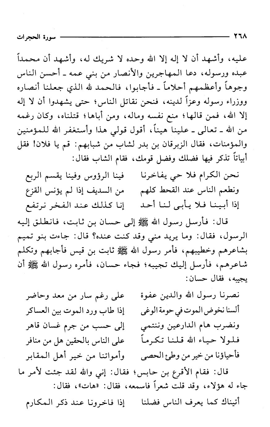 عليه، وأشهد أن لا إله إلا الله وحده لا شريك له، وأشهد أن محمداً عبده ورسوله، دعا المهاجرين والأنصار من بني عمه -أحسن الناس وجوهاً وأعظمهم أحلاماً- فأجابوا، فالحمد لله الذي جعلنا أنصاره ووزراء رسوله وعزاً لدينه، فنحن نقاتل الناس؛ حتى يشهدوا أن لا إله إلا الله، فمن قالها؛ منع نفسه وماله، ومن أباها؛ قتلناه، وكان رغمه من الله -تعالى- علينا هيناً، أقول قولي هذا وأستغفر الله للمؤمنين والمؤمنات، فقال الزبرقان بن بدر لشاب من شبابهم: قم يا فلان! فقل أبياتاً تذكر فيها فضلك وفضل قومك، فقام الشاب فقال: