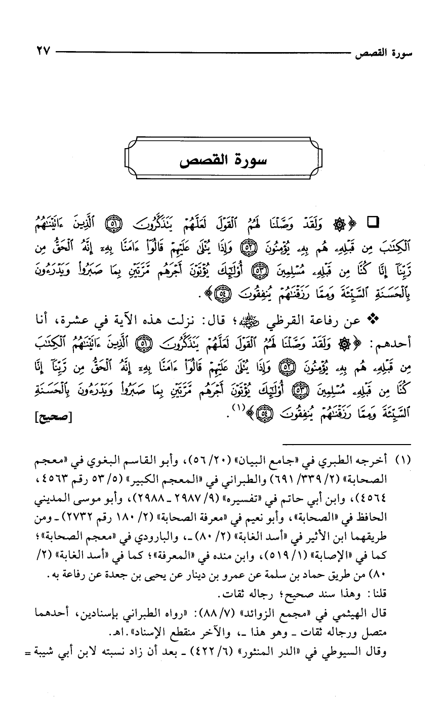 * عن رفاعة القرظي -رضي الله عنه-؛ قال: نزلت هذه الآية في عشرة، أنا أحدهم: {وَلَقَدْ وَصَّلْنَا لَهُمُ الْقَوْلَ لَعَلَّهُمْ يَتَذَكَّرُونَ (51) الَّذِينَ آتَيْنَاهُمُ الْكِتَابَ مِنْ قَبْلِهِ هُمْ بِهِ يُؤْمِنُونَ (52) وَإِذَا يُتْلَى عَلَيْهِمْ قَالُوا آمَنَّا بِهِ إِنَّهُ الْحَقُّ مِنْ رَبِّنَا إِنَّا كُنَّا مِنْ قَبْلِهِ مُسْلِمِينَ (53) أُولَئِكَ يُؤْتَوْنَ أَجْرَهُمْ مَرَّتَيْنِ بِمَا صَبَرُوا وَيَدْرَءُونَ بِالْحَسَنَةِ السَّيِّئَةَ وَمِمَّا رَزَقْنَاهُمْ يُنْفِقُونَ (54)} (¬1). [صحيح]