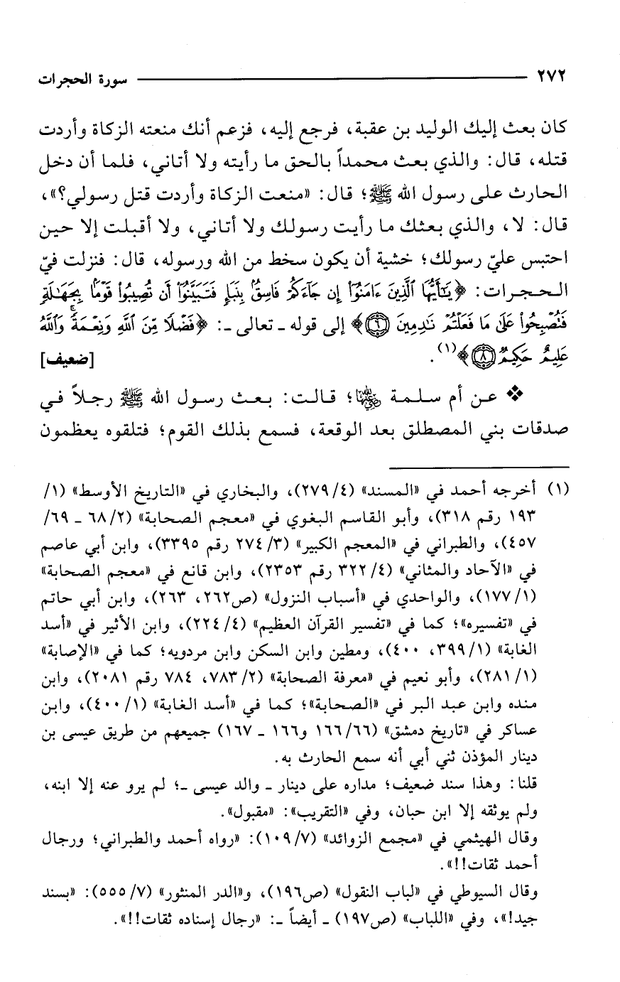 كان بعث إليك الوليد بن عقبة، فرجع إليه، فزعم أنك منعته الزكاة وأردت قتله، قال: والذي بعث محمداً بالحق ما رأيته ولا أتاني، فلما أن دخل الحارث على رسول الله - صلى الله عليه وسلم -؛ قال: "منعت الزكاة وأردت قتل رسولي؟ "، قال: لا، والذي بعثك ما رأيت رسولك ولا أتاني، ولا أقبلت إلا حين احتبس عليّ رسولك؛ خشية أن يكون سخط من الله ورسوله، قال: فنزلت فيّ الحجرات: {يَاأَيُّهَا الَّذِينَ آمَنُوا إِنْ جَاءَكُمْ فَاسِقٌ بِنَبَإٍ فَتَبَيَّنُوا أَنْ تُصِيبُوا قَوْمًا بِجَهَالَةٍ فَتُصْبِحُوا عَلَى مَا فَعَلْتُمْ نَادِمِينَ (6)} إلى قوله -تعالى-: {فَضْلًا مِنَ اللَّهِ وَنِعْمَةً وَاللَّهُ عَلِيمٌ حَكِيمٌ (8)} (¬1). [ضعيف]