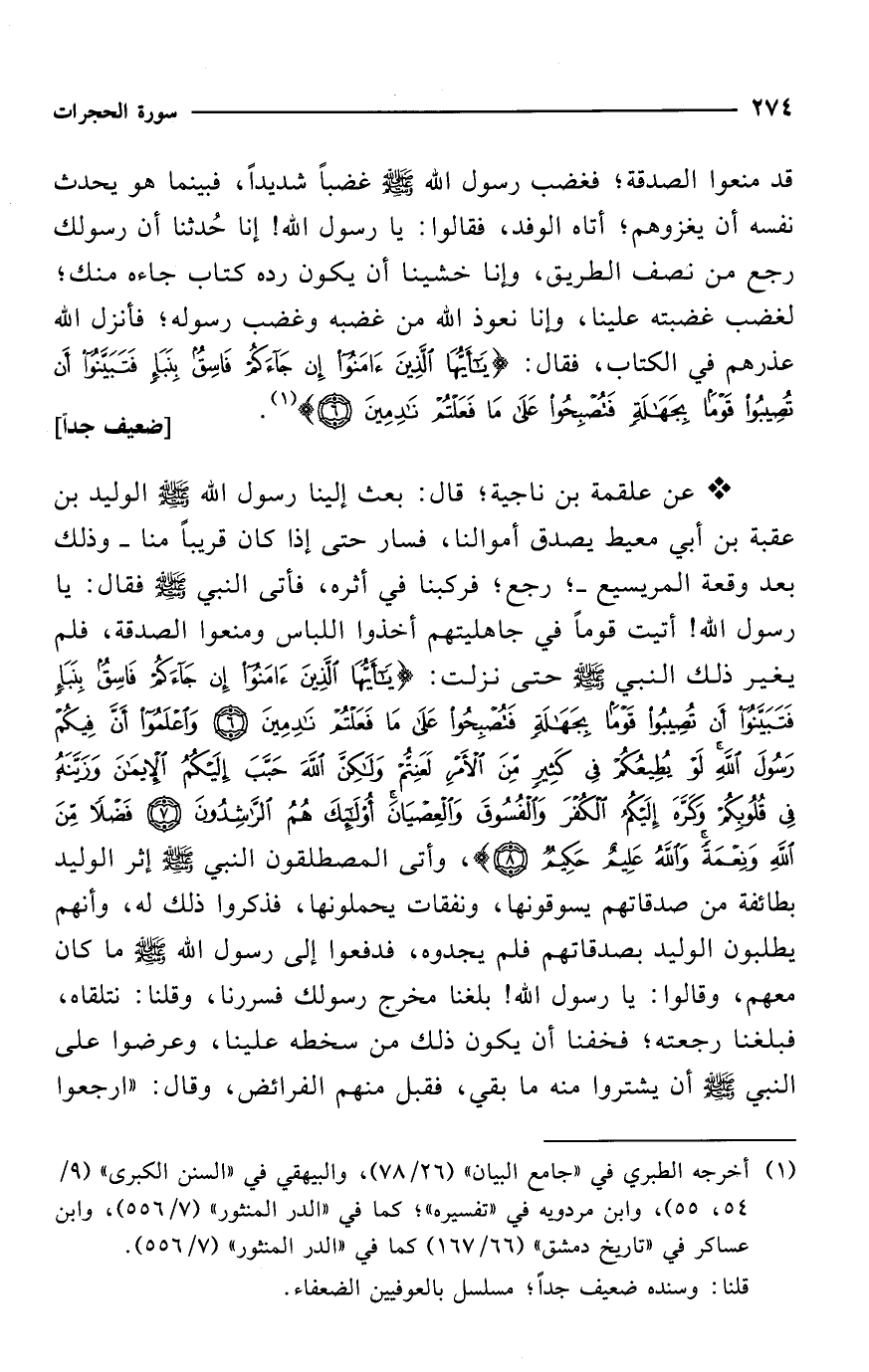 * عن علقمة بن ناجية؛ قال: بعث إلينا رسول الله - صلى الله عليه وسلم - الوليد بن عقبة بن أبي معيط يصدق أموالنا، فسار حتى إذا كان قريباً منا -وذلك بعد وقعة المريسيع-؛ رجع؛ فركبنا في أثره، فأتى النبي - صلى الله عليه وسلم - فقال: يا رسول الله! أتيت قوماً في جاهليتهم أخذوا اللباس ومنعوا الصدقة، فلم يغير ذلك النبي - صلى الله عليه وسلم - حتى نزلت: {يَاأَيُّهَا الَّذِينَ آمَنُوا إِنْ جَاءَكُمْ فَاسِقٌ بِنَبَإٍ فَتَبَيَّنُوا أَنْ تُصِيبُوا قَوْمًا بِجَهَالَةٍ فَتُصْبِحُوا عَلَى مَا فَعَلْتُمْ نَادِمِينَ (6) وَاعْلَمُوا أَنَّ فِيكُمْ رَسُولَ اللَّهِ لَوْ يُطِيعُكُمْ فِي كَثِيرٍ مِنَ الْأَمْرِ لَعَنِتُّمْ وَلَكِنَّ اللَّهَ حَبَّبَ إِلَيْكُمُ الْإِيمَانَ وَزَيَّنَهُ فِي قُلُوبِكُمْ وَكَرَّهَ إِلَيْكُمُ الْكُفْرَ وَالْفُسُوقَ وَالْعِصْيَانَ أُولَئِكَ هُمُ الرَّاشِدُونَ (7) فَضْلًا مِنَ اللَّهِ وَنِعْمَةً وَاللَّهُ عَلِيمٌ حَكِيمٌ (8)}، وأتى المصطلقون النبي - صلى الله عليه وسلم - إثر الوليد بطائفة من صدقاتهم يسوقونها، ونفقات يحملونها، فذكروا ذلك له، وأنهم يطلبون الوليد بصدقاتهم فلم يجدوه، فدفعوا إلى رسول الله - صلى الله عليه وسلم - ما كان معهم، وقالوا: يا رسول الله! بلغنا مخرج رسولك فسررنا، وقلنا: نتلقاه، فبلغنا رجعته؛ فخفنا أن يكون ذلك من سخطه علينا، وعرضوا على النبي - صلى الله عليه وسلم - أن يشتروا منه ما بقي، فقبل منهم الفرائض، وقال: "ارجعوا