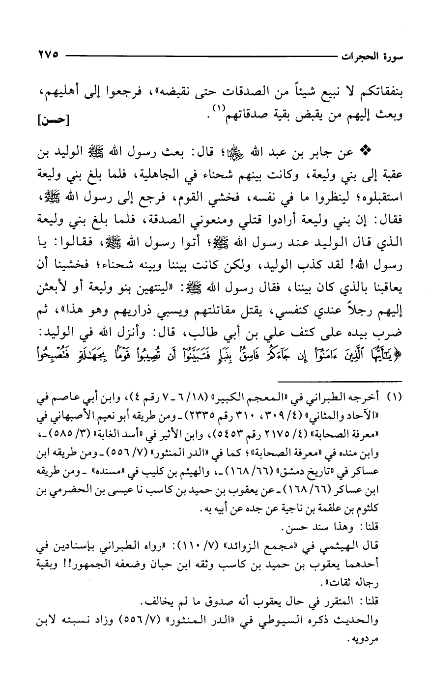 * عن جابر بن عبد الله -رضي الله عنهما-؛ قال: بعث رسول الله - صلى الله عليه وسلم - الوليد بن عقبة إلى بني وليعة، وكانت بينهم شحناء في الجاهلية، فلما بلغ بني وليعة استقبلوه؛ لينظروا ما في نفسه، فخشي القوم، فرجع إلى رسول الله - صلى الله عليه وسلم -، فقال: إن بني وليعة أرادوا قتلي ومنعوني الصدقة، فلما بلغ بني وليعة الذي قال الوليد عند رسول الله - صلى الله عليه وسلم -؛ أتوا رسول الله - صلى الله عليه وسلم -، فقالوا: يا رسول الله! لقد كذب الوليد، ولكن كانت بيننا وبينه شحناء؛ فخشينا أن يعاقبنا بالذي كان بيننا، فقال رسول الله - صلى الله عليه وسلم -: "لينتهين بنو وليعة أو لأبعثن إليهم رجلًا عندي كنفسي، يقتل مقاتلتهم ويسبي ذراريهم وهو هذا"، ثم ضرب بيده على كتف علي بن أبي طالب، قال: وأنزل الله في الوليد: {يَاأَيُّهَا الَّذِينَ آمَنُوا إِنْ جَاءَكُمْ فَاسِقٌ بِنَبَإٍ فَتَبَيَّنُوا أَنْ تُصِيبُوا قَوْمًا بِجَهَالَةٍ فَتُصْبِحُوا