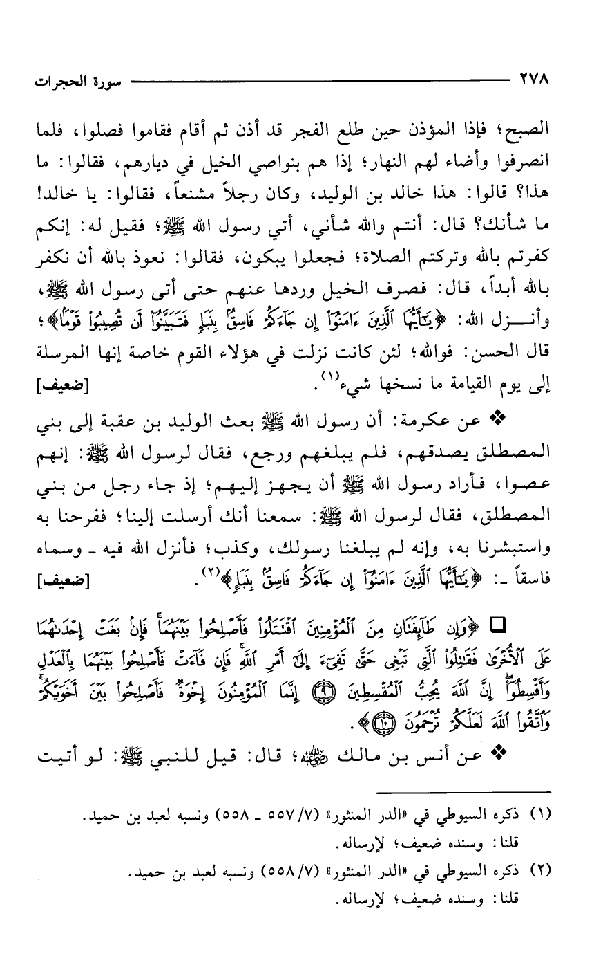 الصبح؛ فإذا المؤذن حين طلع الفجر قد أذن ثم أقام فقاموا فصلوا، فلما انصرفوا وأضاء لهم النهار؛ إذا هم بنواصي الخيل في ديارهم، فقالوا: ما هذا؟ قالوا: هذا خالد بن الوليد، وكان رجلاً مشنعاً، فقالوا: يا خالد! ما شأنك؟ قال: أنتم والله شأني، أتي رسول الله - صلى الله عليه وسلم -؛ فقيل له: إنكم كفرتم بالله وتركتم الصلاة؛ فجعلوا يبكون، فقالوا: نعوذ بالله أن نكفر بالله أبداً، قال: فصرف الخيل وردها عنهم حتى أتى رسول الله - صلى الله عليه وسلم -، وأنزل الله: {يَاأَيُّهَا الَّذِينَ آمَنُوا إِنْ جَاءَكُمْ فَاسِقٌ بِنَبَإٍ فَتَبَيَّنُوا أَنْ تُصِيبُوا قَوْمًا}؛ قال الحسن: فوالله؛ لئن كانت نزلت في هؤلاء القوم خاصة إنها المرسلة إلى يوم القيامة ما نسخها شيء (¬1). [ضعيف]