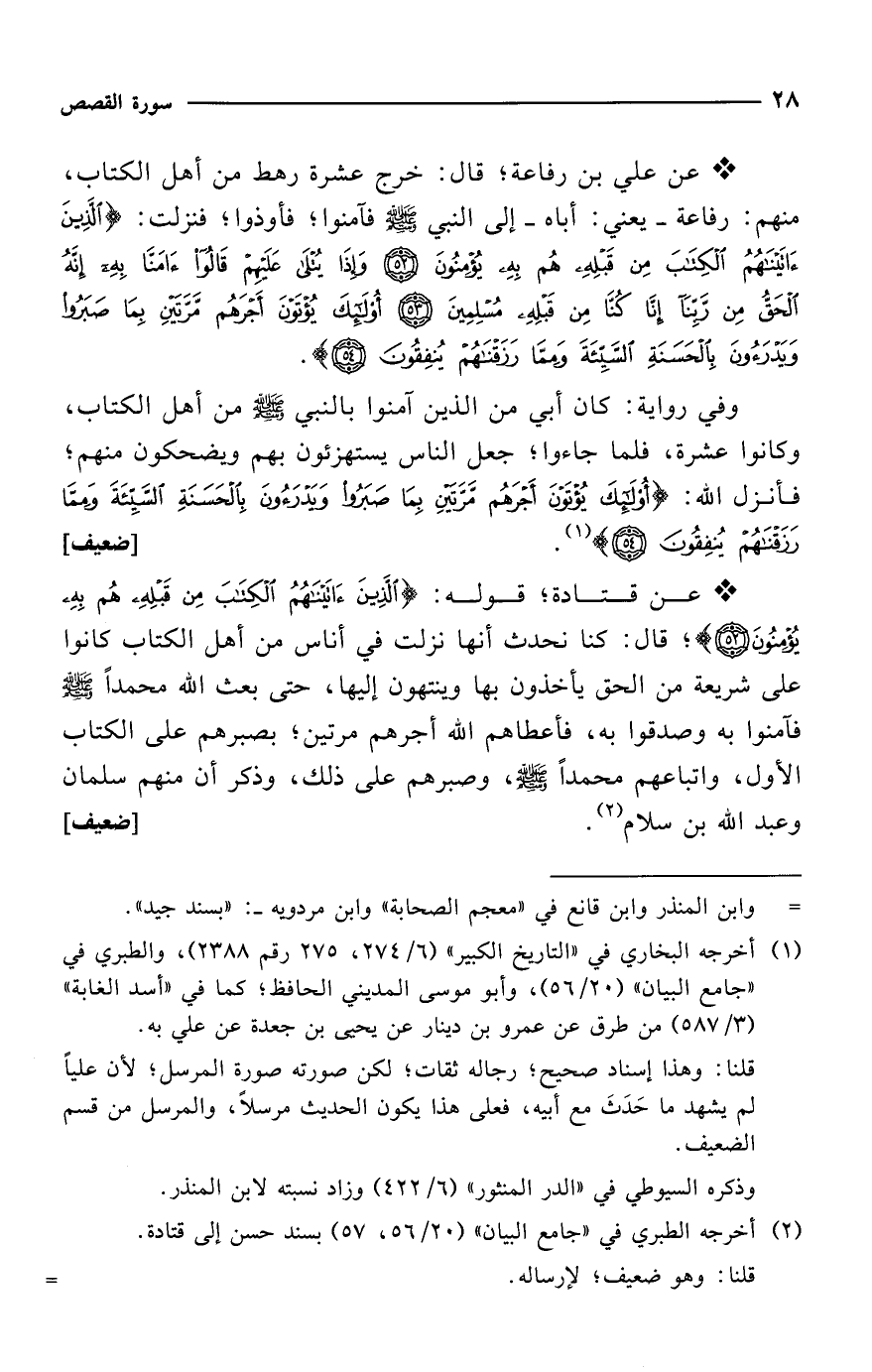 * عن علي بن رفاعة؛ قال: خرج عشرة رهط من أهل الكتاب، منهم: رفاعة -يعني: أباه- إلى النبي - صلى الله عليه وسلم - فآمنوا؛ فأوذوا؛ فنزلت: {الَّذِينَ آتَيْنَاهُمُ الْكِتَابَ مِنْ قَبْلِهِ هُمْ بِهِ يُؤْمِنُونَ (52) وَإِذَا يُتْلَى عَلَيْهِمْ قَالُوا آمَنَّا بِهِ إِنَّهُ الْحَقُّ مِنْ رَبِّنَا إِنَّا كُنَّا مِنْ قَبْلِهِ مُسْلِمِينَ (53) أُولَئِكَ يُؤْتَوْنَ أَجْرَهُمْ مَرَّتَيْنِ بِمَا صَبَرُوا وَيَدْرَءُونَ بِالْحَسَنَةِ السَّيِّئَةَ وَمِمَّا رَزَقْنَاهُمْ يُنْفِقُونَ (54)}.