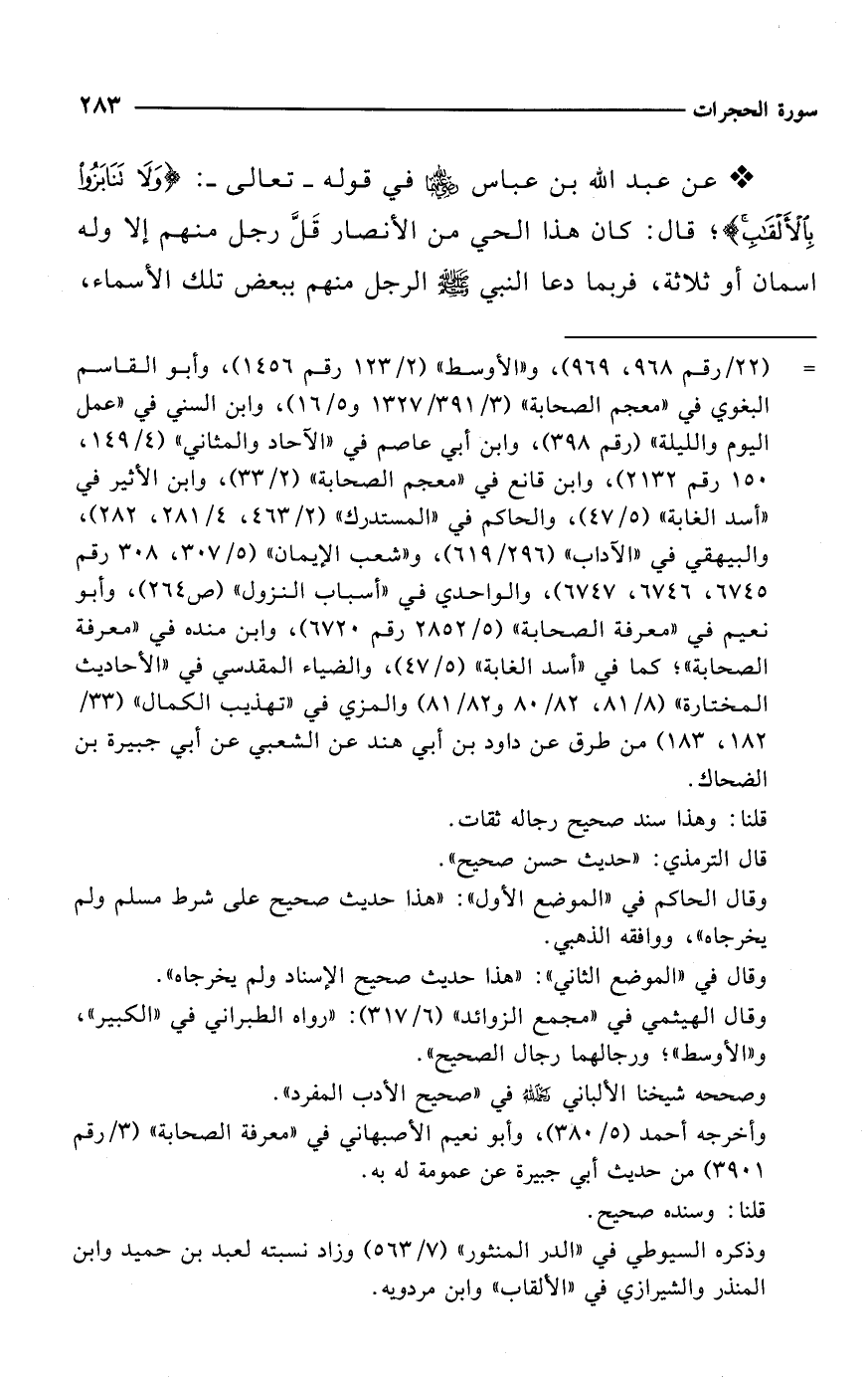 * عن عبد الله بن عباس -رضي الله عنهما- في قوله -تعالى-: {وَلَا تَنَابَزُوا بِالْأَلْقَابِ}؛ قال: كان هذا الحي من الأنصار قَلَّ رجل منهم إلا وله اسمان أو ثلاثة، فربما دعا النبي - صلى الله عليه وسلم - الرجل منهم ببعض تلك الأسماء،