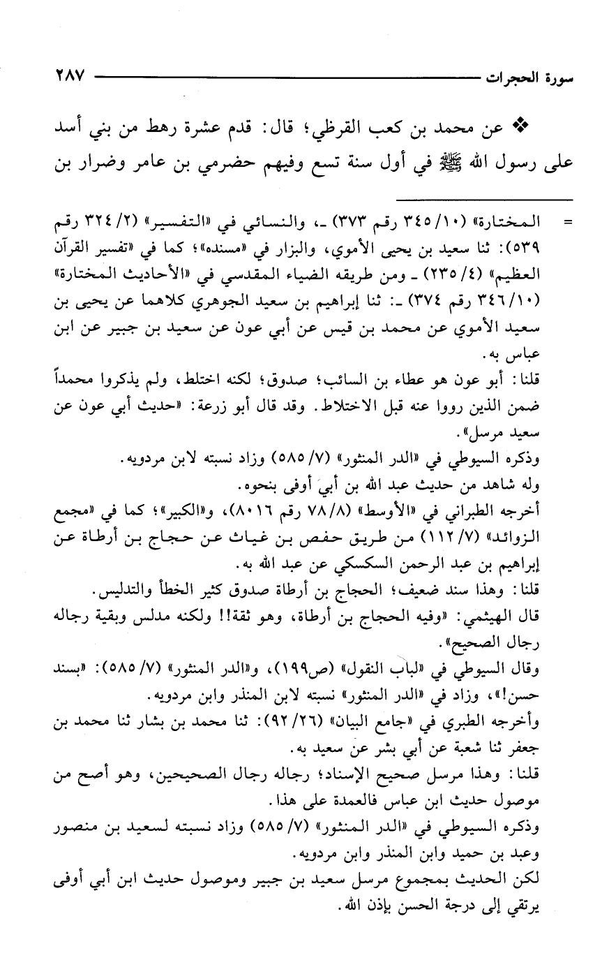 * عن محمد بن كعب القرظي؛ قال: قدم عشرة رهط من بني أسد على رسول الله - صلى الله عليه وسلم - في أول سنة تسع وفيهم حضرمي بن عامر وضرار بن
