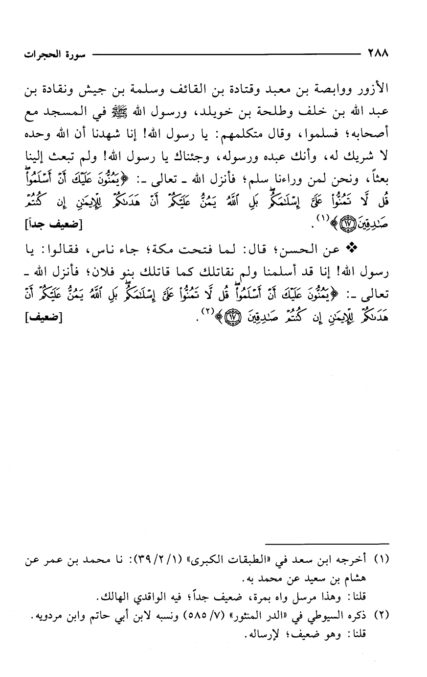 * عن الحسن؛ قال: لما فتحت مكة؛ جاء ناس، فقالوا: يا رسول الله! إنا قد أسلمنا ولم نقاتلك كما قاتلك بنو فلان؛ فأنزل الله -تعالى-: {يَمُنُّونَ عَلَيْكَ أَنْ أَسْلَمُوا قُلْ لَا تَمُنُّوا عَلَيَّ إِسْلَامَكُمْ بَلِ اللَّهُ يَمُنُّ عَلَيْكُمْ أَنْ هَدَاكُمْ لِلْإِيمَانِ إِنْ كُنْتُمْ صَادِقِينَ (17)} (¬2). [ضعيف]