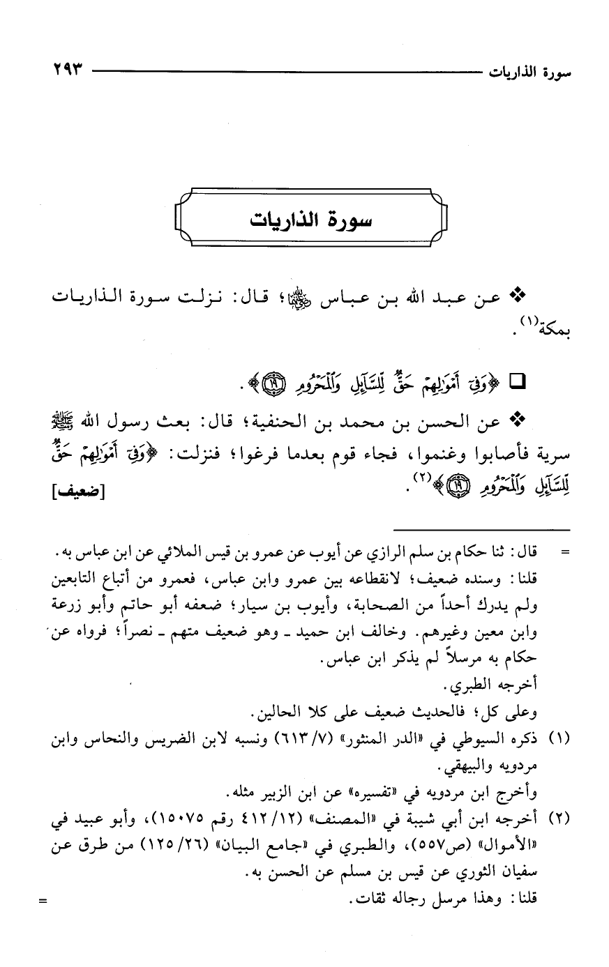 * عن الحسن بن محمد بن الحنفية؛ قال: بعث رسول الله - صلى الله عليه وسلم - سرية فأصابوا وغنموا، فجاء قوم بعدما فرغوا؛ فنزلت: {وَفِي أَمْوَالِهِمْ حَقٌّ لِلسَّائِلِ وَالْمَحْرُومِ (19)} (¬2). [ضعيف]