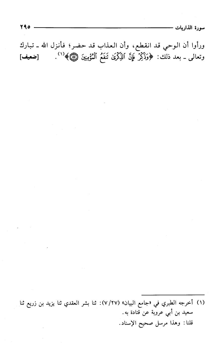 ورأوا أن الوحي قد انقطع، وأن العذاب قد حضر؛ فأنزل الله -تبارك وتعالى- بعد ذلك: {وَذَكِّرْ فَإِنَّ الذِّكْرَى تَنْفَعُ الْمُؤْمِنِينَ (55)} (¬1). [ضعيف]