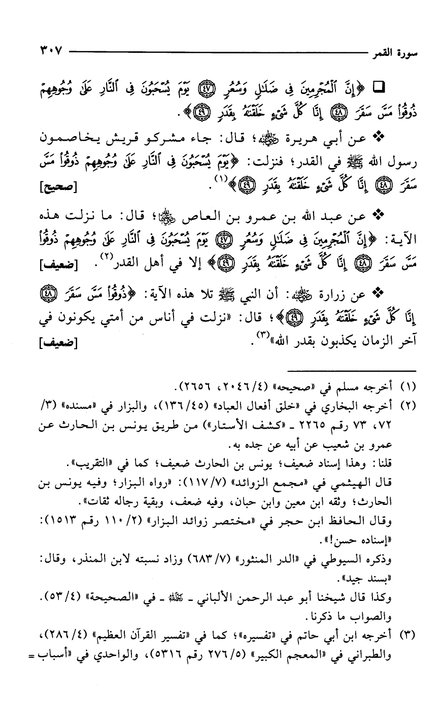 * عن عبد الله بن عمرو بن العاص -رضي الله عنهما-؛ قال: ما نزلت هذه الآية: {إِنَّ الْمُجْرِمِينَ فِي ضَلَالٍ وَسُعُرٍ (47) يَوْمَ يُسْحَبُونَ فِي النَّارِ عَلَى وُجُوهِهِمْ ذُوقُوا مَسَّ سَقَرَ (48) إِنَّا كُلَّ شَيْءٍ خَلَقْنَاهُ بِقَدَرٍ (49)} إلا في أهل القدر (¬2). [ضعيف]