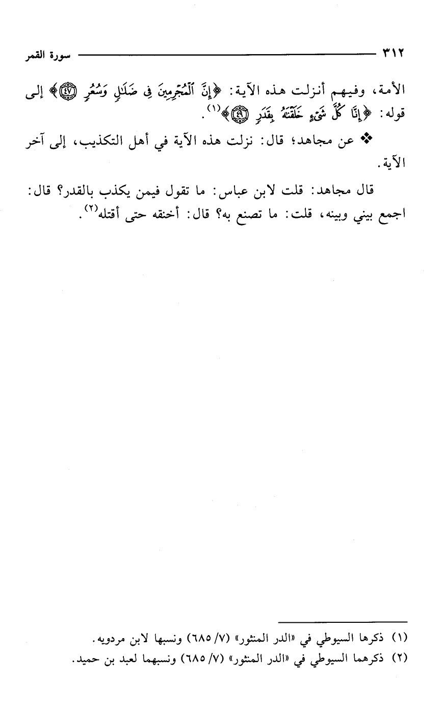 الأمة، وفيهم أنزلت هذه الآية: {إِنَّ الْمُجْرِمِينَ فِي ضَلَالٍ وَسُعُرٍ (47)} إلى قوله: {إِنَّا كُلَّ شَيْءٍ خَلَقْنَاهُ بِقَدَرٍ (49)} (¬1).