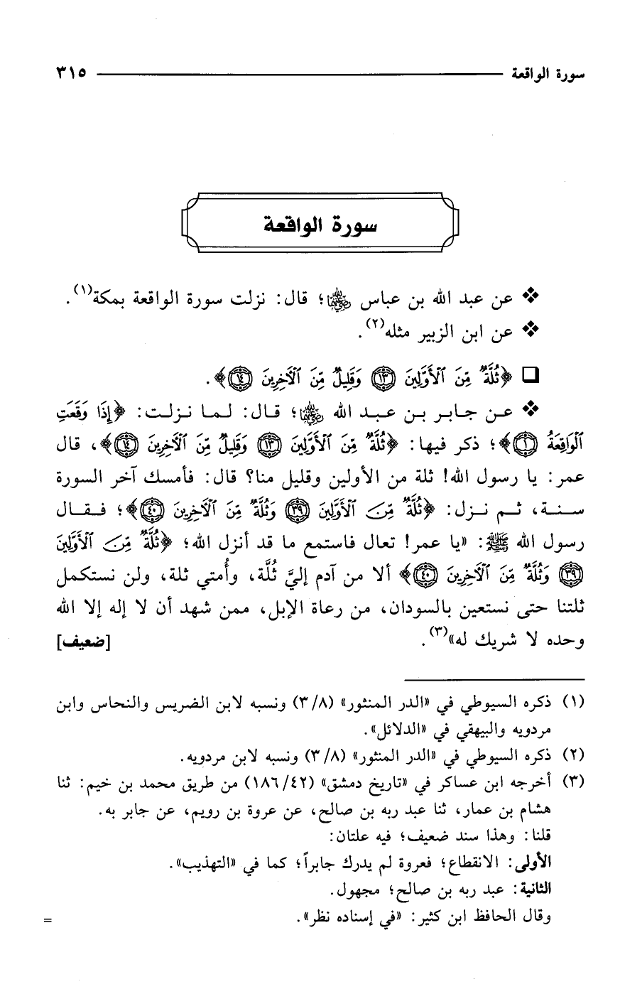 * عن جابر بن عبد الله -رضي الله عنهما-؛ قال: لما نزلت: {إِذَا وَقَعَتِ الْوَاقِعَةُ (1)}؛ ذكر فيها: {ثُلَّةٌ مِنَ الْأَوَّلِينَ (13) وَقَلِيلٌ مِنَ الْآخِرِينَ (14)}، قال عمر: يا رسول الله! ثلة من الأولين وقليل منا؟ قال: فأمسك آخر السورة سنة، ثم نزل: {ثُلَّةٌ مِنَ الْأَوَّلِينَ (13) وَقَلِيلٌ مِنَ الْآخِرِينَ (14)}؛ فقال رسول الله - صلى الله عليه وسلم -: "يا عمر! تعال فاستمع ما قد أنزل الله؛ {ثُلَّةٌ مِنَ الْأَوَّلِينَ (13) وَقَلِيلٌ مِنَ الْآخِرِينَ (14)} ألا من آدم إليَّ ثُلَّة، وأُمتي ثلة، ولن نستكمل ثلتنا حتى نستعين بالسودان، من رعاة الإبل، ممن شهد أن لا إله إلا الله وحده لا شريك له" (¬3). [ضعيف]